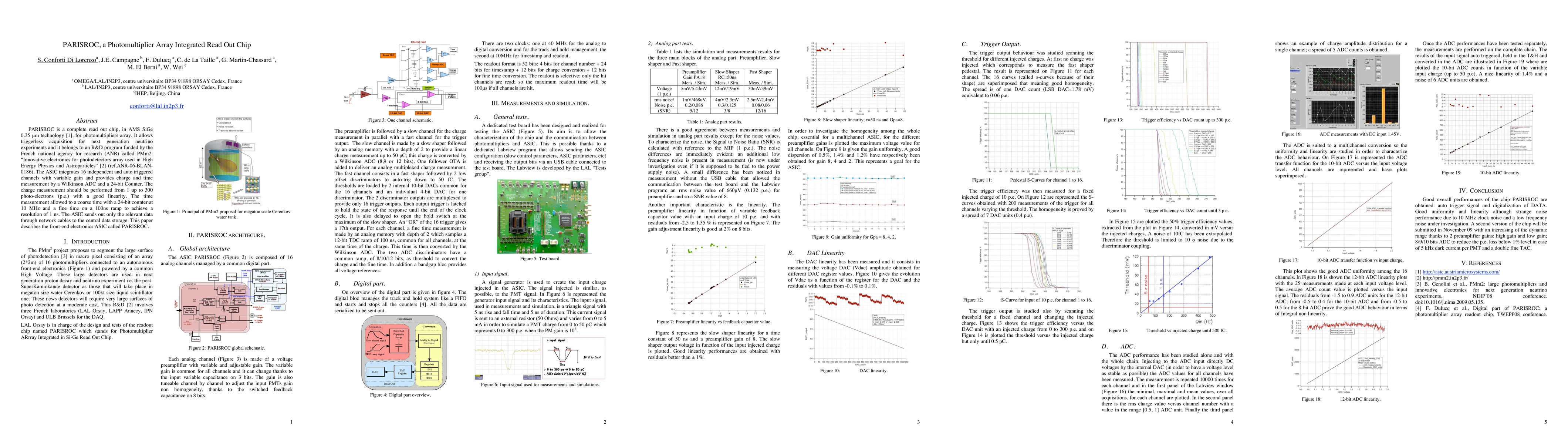 PARISROC is a complete read out chip, in AMS SiGe 0.35 micron technology [1], for photomultipliers array. It allows triggerless acquisition for next generation neutrino experiments and it belongs to an R&D program funded by the French national agency for research (ANR) called PMm2: Innovative electronics for photodetectors array used in High Energy Physics and Astroparticles [2] (ref.ANR-06-BLAN- 0186). The ASIC integrates 16 independent and auto triggered channels with variable gain and provides charge and time measurement by a Wilkinson ADC and a 24-bit Counter. The charge measurement should be performed from 1 up to 300 photo-electrons (p.e.) with a good linearity. The time measurement allowed to a coarse time with a 24-bit counter at 10 MHz and a fine time on a 100ns ramp to achieve a resolution of 1 ns. The ASIC sends out only the relevant data through network cables to the central data storage. This paper describes the front-end electronics ASIC called PARISROC.