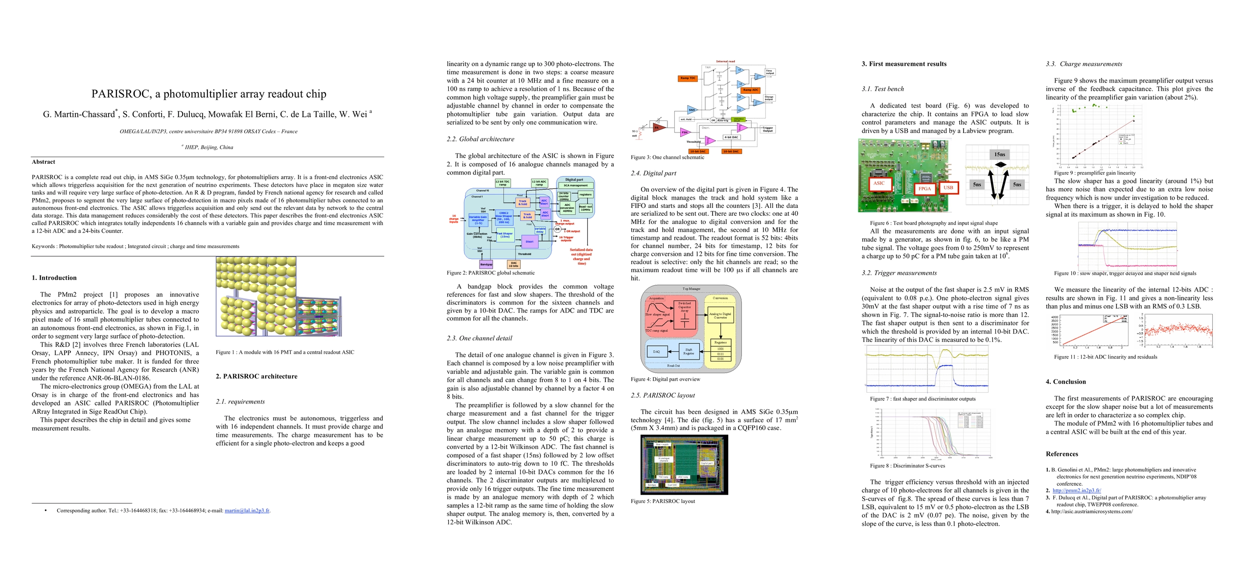 PARISROC is a complete read out chip, in AMS SiGe 0.35 micron technology, for photomultipliers array. It is a front-end electronics ASIC which allows triggerless acquisition for the next generation of neutrino experiments. These detectors have place in megaton size water tanks and will require very large surface of photo-detection. An R & D program, funded by French national agency for research and called PMm2, proposes to segment the very large surface of photo-detection in macro pixels made of 16 photomultiplier tubes connected to an autonomous front-end electronics. The ASIC allows triggerless acquisition and only send out the relevant data by network to the central data storage. This data management reduces considerably the cost of these detectors. This paper describes the front-end electronics ASIC called PARISROC which integrates totally independents 16 channels with a variable gain and provides charge and time measurement with a 12-bit ADC and a 24-bits Counter.