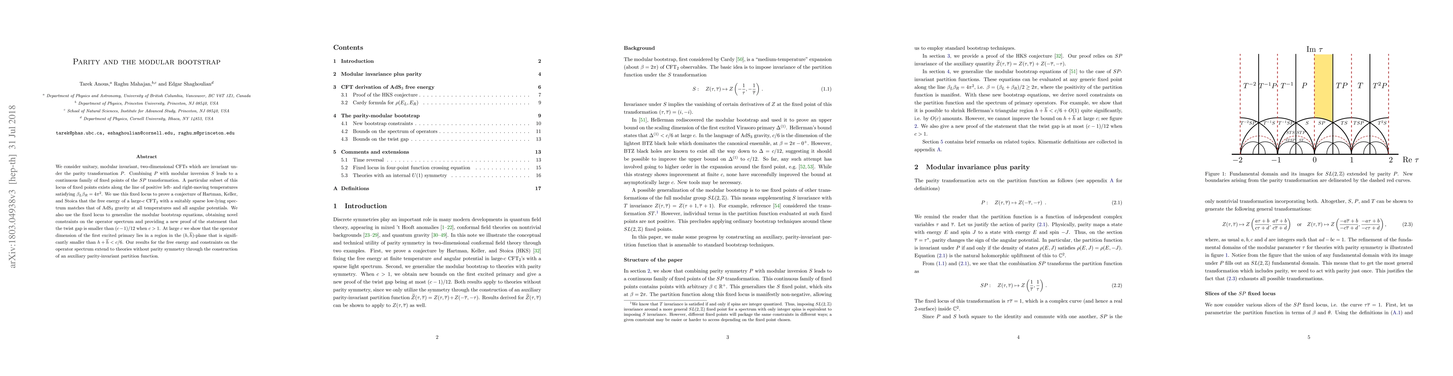 This paper explores unitary, modular invariant CFTs invariant under parity, using a fixed locus of modular inversion to prove a conjecture on large-$c$ CFT$_2$ free energy matching AdS$_3$ gravity and to generalize the modular bootstrap equations. It also provides constraints on the operator spectrum and proves that the twist gap is smaller than $(c-1)/12$ for $c>1$.