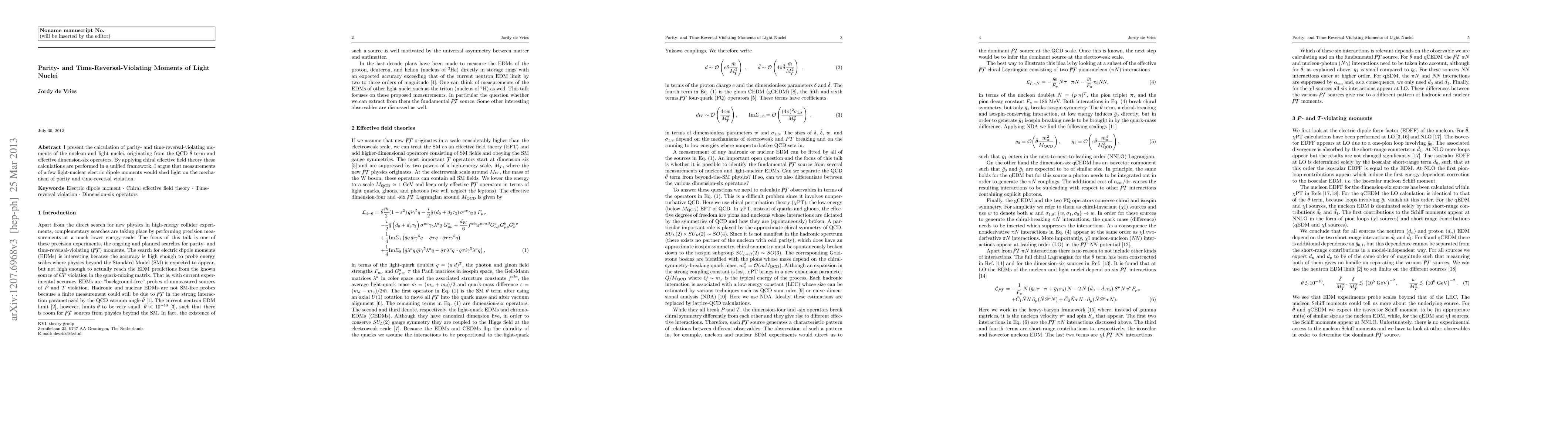 This paper calculates the parity- and time-reversal-violating moments of nucleons and light nuclei, attributing them to the QCD theta term and effective dimension-six operators. Using chiral effective field theory, it proposes that measuring light-nuclear electric dipole moments could reveal the underlying mechanisms of parity and time-reversal violation.