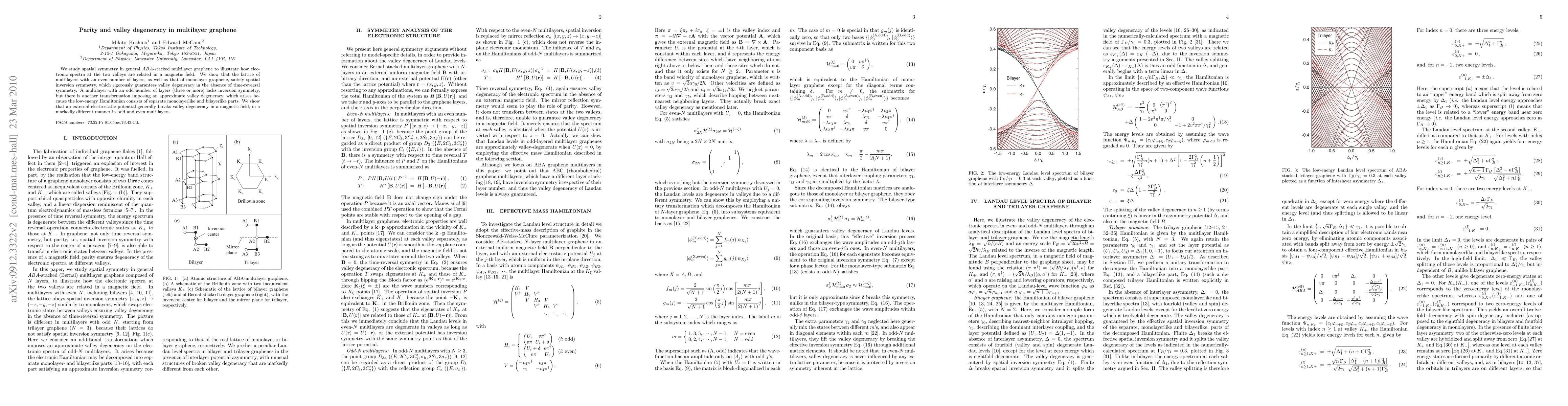 We study spatial symmetry in general ABA-stacked multilayer graphene to illustrate how electronic spectra at the two valleys are related in a magnetic field. We show that the lattice of multilayers with an even number of layers, as well as that of monolayer graphene, satisfy spatial inversion symmetry, which rigorously guarantees valley degeneracy in the absence of time-reversal symmetry. A multilayer with an odd number of layers (three or more) lacks inversion symmetry, but there is another transformation imposing an approximate valley degeneracy, which arises because the low-energy Hamiltonian consists of separate monolayerlike and bilayerlike parts. We show that an external electrostatic potential generally breaks valley degeneracy in a magnetic field, in a markedly different manner in odd and even multilayers.