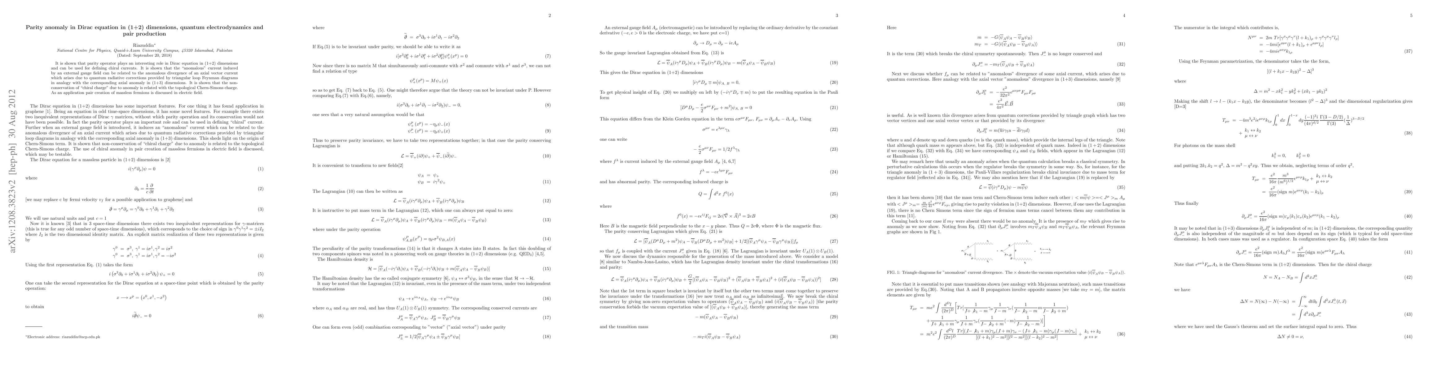 This paper explores the parity anomaly in the Dirac equation within (1+2) dimensions, demonstrating its role in defining chiral currents and linking it to the anomalous divergence of axial vector currents due to quantum radiative corrections. It connects the non-conservation of chiral charge to the topological Chern-Simons charge and discusses the pair creation of massless fermions in an electric field.