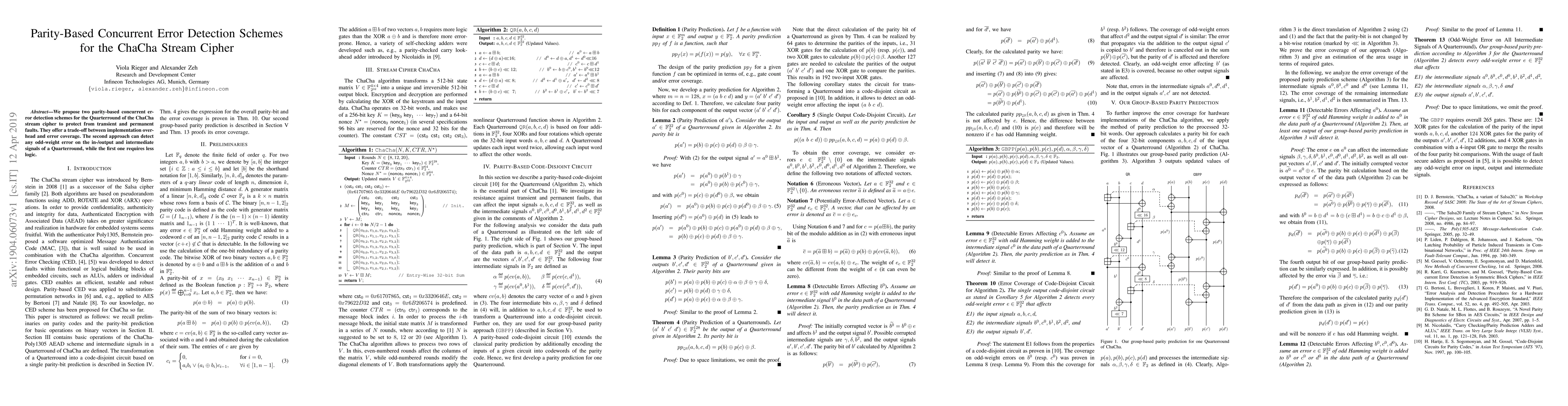 This paper presents two parity-based concurrent error detection schemes for the Quarterround of the ChaCha stream cipher, balancing implementation overhead with error coverage. The second scheme can detect any odd-weight error, while the first requires less logic.