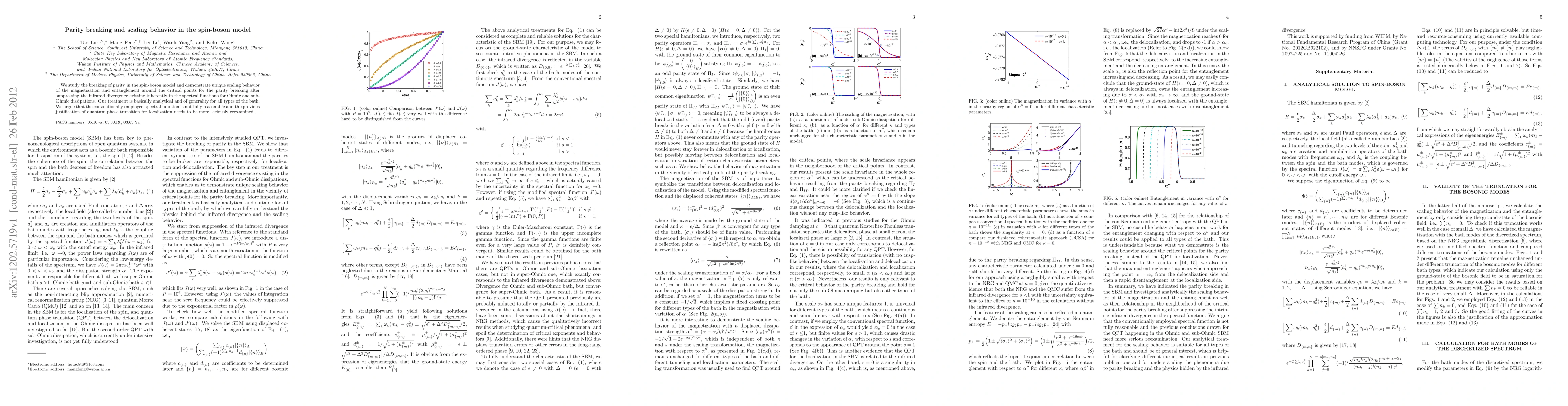 This paper investigates the parity breaking in the spin-boson model, revealing unique scaling behavior of magnetization and entanglement near critical points. It critiques the conventional spectral function and calls for a reevaluation of the justification for quantum phase transitions in localization.