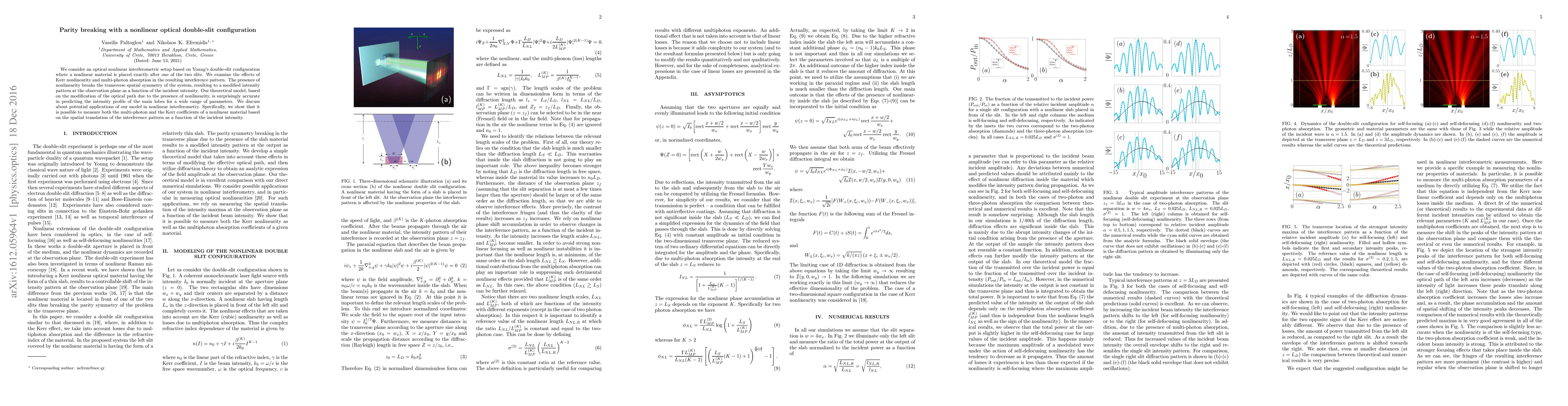 We consider an optical nonlinear interferometric setup based on Young's double-slit configuration where a nonlinear material is placed exactly after one of the two slits. We examine the effects of Kerr nonlinearity and multi-photon absorption in the resulting interference pattern. The presence of nonlinearity breaks the transverse spatial symmetry of the system, resulting to a modified intensity pattern at the observation plane as a function of the incident intensity. Our theoretical model, based on the modification of the optical path due to the presence of nonlinearity, is surprisingly accurate in predicting the intensity profile of the main lobes for a wide range of parameters. We discuss about potential applications of our model in nonlinear interferometry. Specifically, we show that it is possible to measure both the multi-photon and the Kerr coefficients of a nonlinear material based on the spatial translation of the interference pattern as a function of the incident intensity.