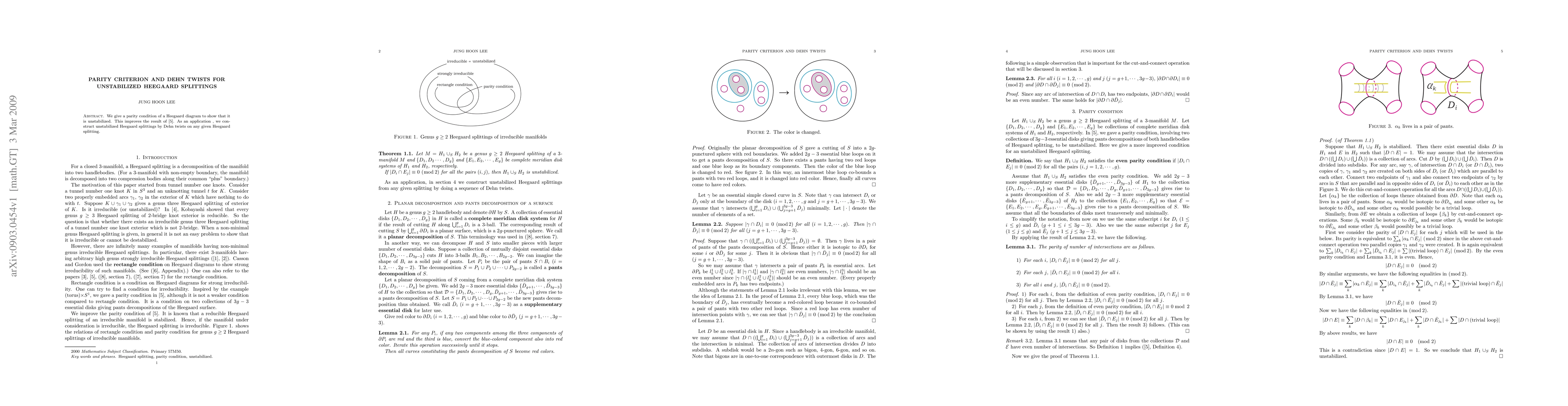 The paper establishes a parity condition to identify unstabilized Heegaard diagrams and improves upon previous results. It also demonstrates how to create unstabilized Heegaard splittings via Dehn twists on any given Heegaard splitting.