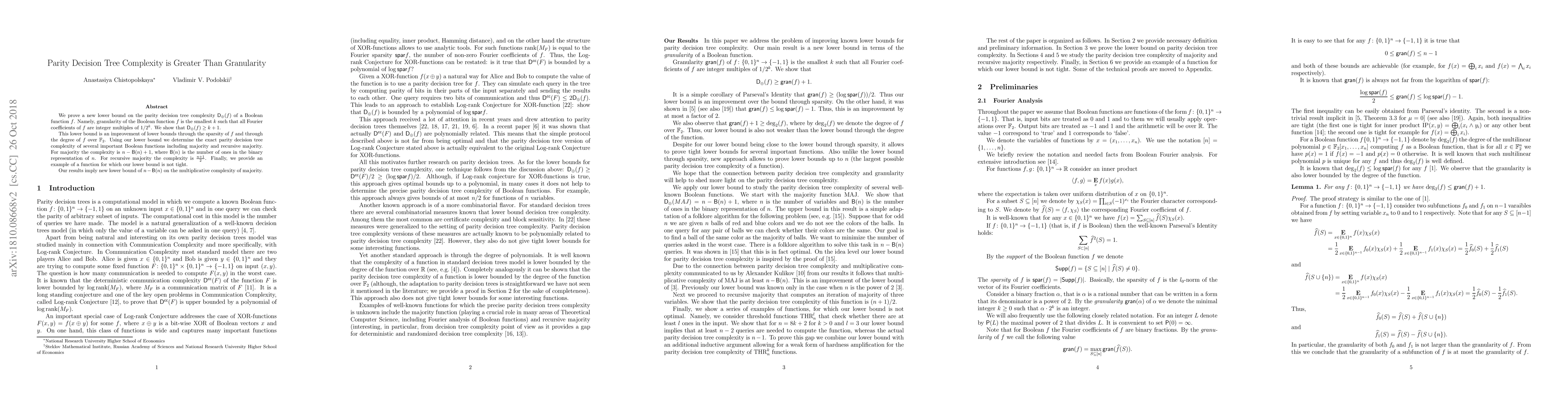 This paper establishes a new lower bound for the parity decision tree complexity $\mathsf{D}_{\oplus}(f)$, showing it is at least $k+1$ where $k$ is the granularity of $f$. It also determines the exact complexities for functions like majority and recursive majority, and provides an example where the bound is not tight.
