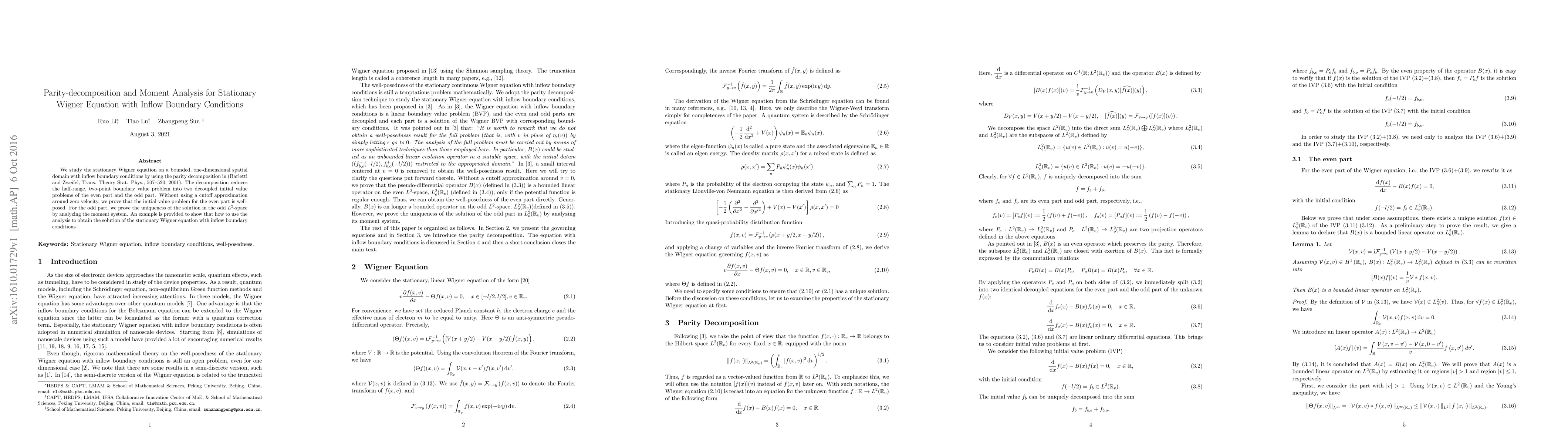 This research introduces a method using parity-decomposition to simplify the stationary Wigner equation in a one-dimensional domain with inflow boundary conditions. It proves well-posedness for the even part's initial value problem and uniqueness for the odd part's solution in odd L^2-space, demonstrating the approach with an example.