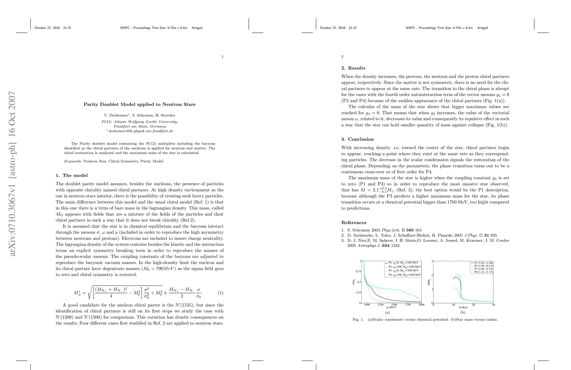 This paper applies the Parity Doublet Model to neutron star matter, exploring chiral restoration and calculating the maximum mass of neutron stars using SU(2) multiplets that include baryons as chiral partners of nucleons.