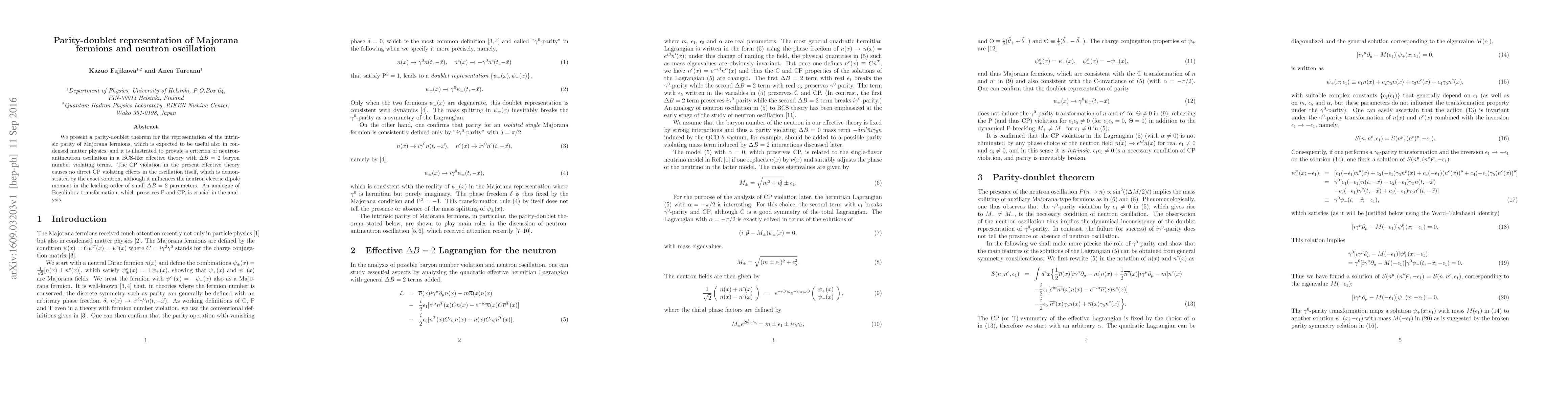 This paper introduces a parity-doublet theorem for Majorana fermions and applies it to analyze neutron-antineutron oscillation in a BCS-like effective theory. The study finds no direct CP violation in the oscillation but shows its influence on the neutron electric dipole moment.