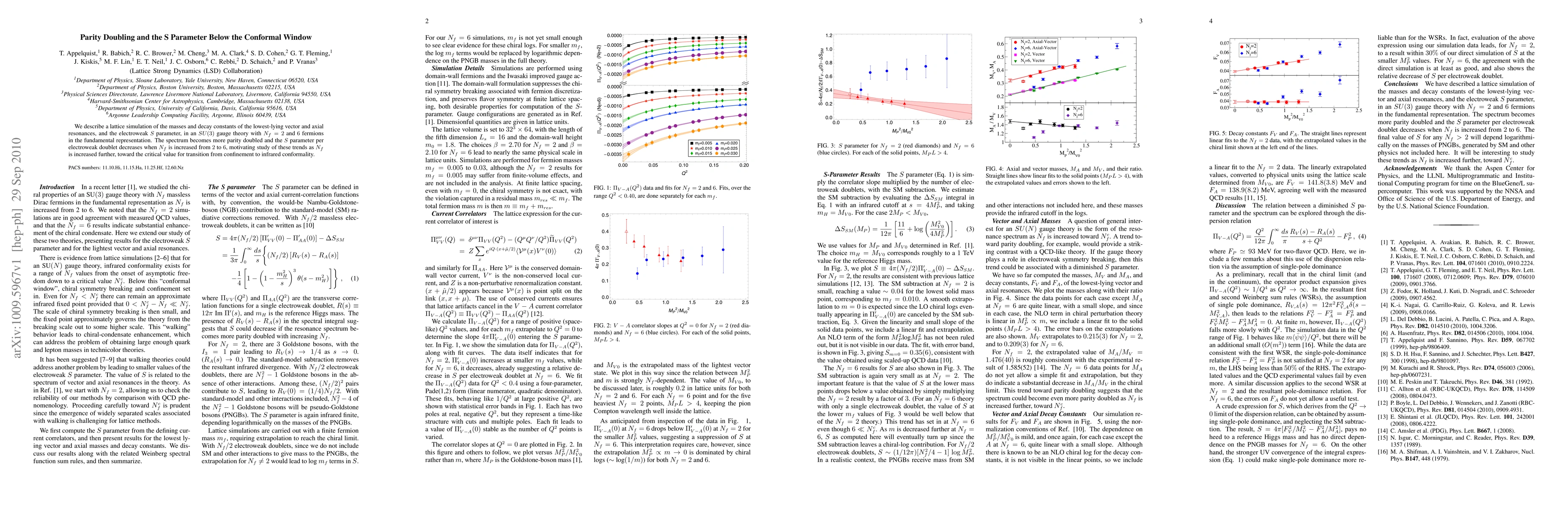 Researchers studied how adding more fermions to a gauge theory affects resonance masses, decay constants, and the electroweak S parameter, finding that increasing fermion numbers leads to increased parity doubling and decreased S parameter values.