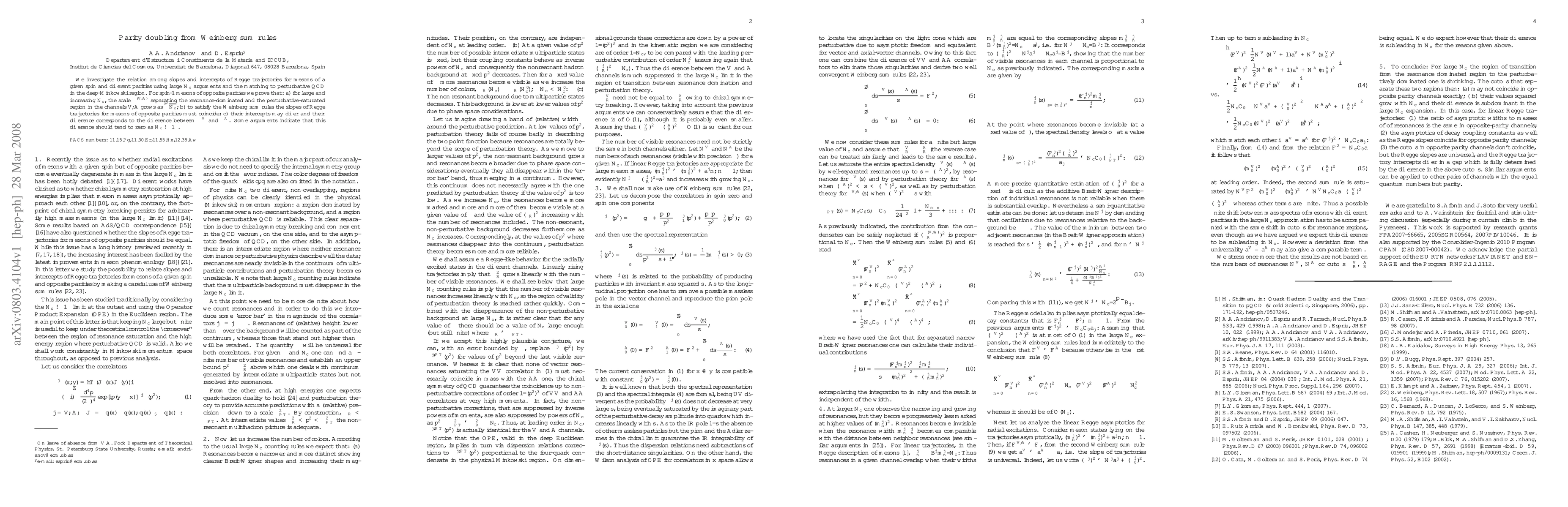We investigate the relation among slopes and intercepts of Regge trajectories for mesons of a given spin and different parities using large N_c arguments and the matching to perturbative QCD in the deep-Minkowski region. For spin-1 mesons of opposite parities we prove that: a) for large and increasing N_c, the scale \Lambda^{(V,A)} separating the resonance-dominated and the perturbative-saturated region in the channels V,A grows as \sqrt{N_c}; b) to satisfy the Weinberg sum rules the slopes of Regge trajectories for mesons of opposite parities must coincide; c) their intercepts may differ and their difference corresponds to the difference between \Lambda^V and \Lambda^A. Some arguments indicate that this difference should tend to zero as N_c\to\infty.