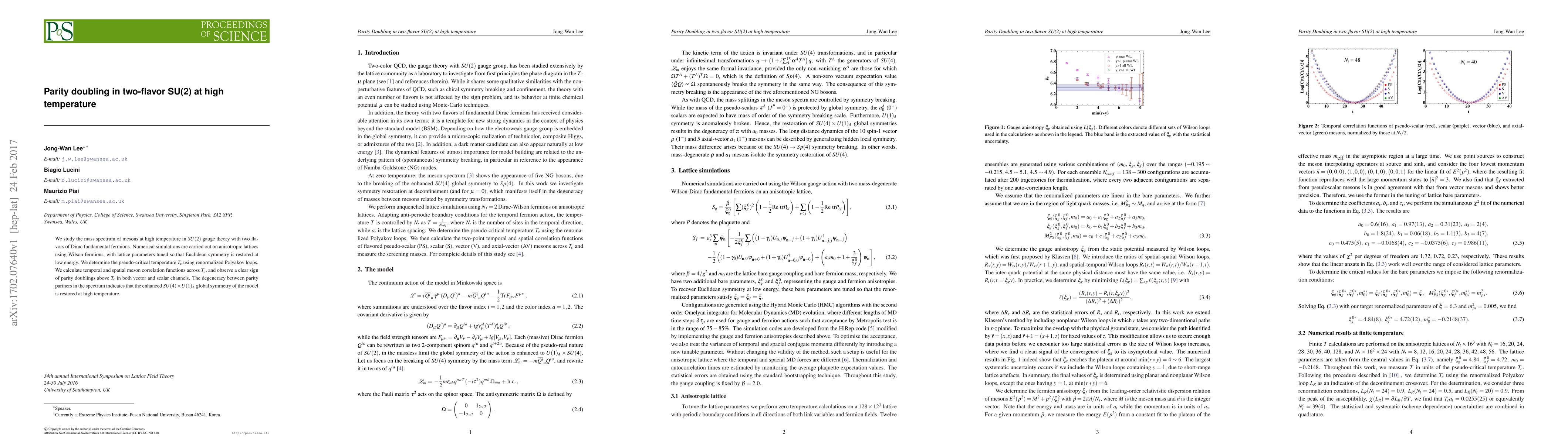 We study the mass spectrum of mesons at high temperature in $SU(2)$ gauge theory with two flavors of Dirac fundamental fermions. Numerical simulations are carried out on anisotropic lattices using Wilson fermions, with lattice parameters tuned so that Euclidean symmetry is restored at low energy. We determine the pseudo-critical temperature $T_c$ using renormalized Polyakov loops. We calculate temporal and spatial meson correlation functions across $T_c$, and observe a clear sign of parity doublings above $T_c$ in both vector and scalar channels. The degeneracy between parity partners in the spectrum indicates that the enhanced $SU(4) \times U(1)_A$ global symmetry of the model is restored at high temperature.