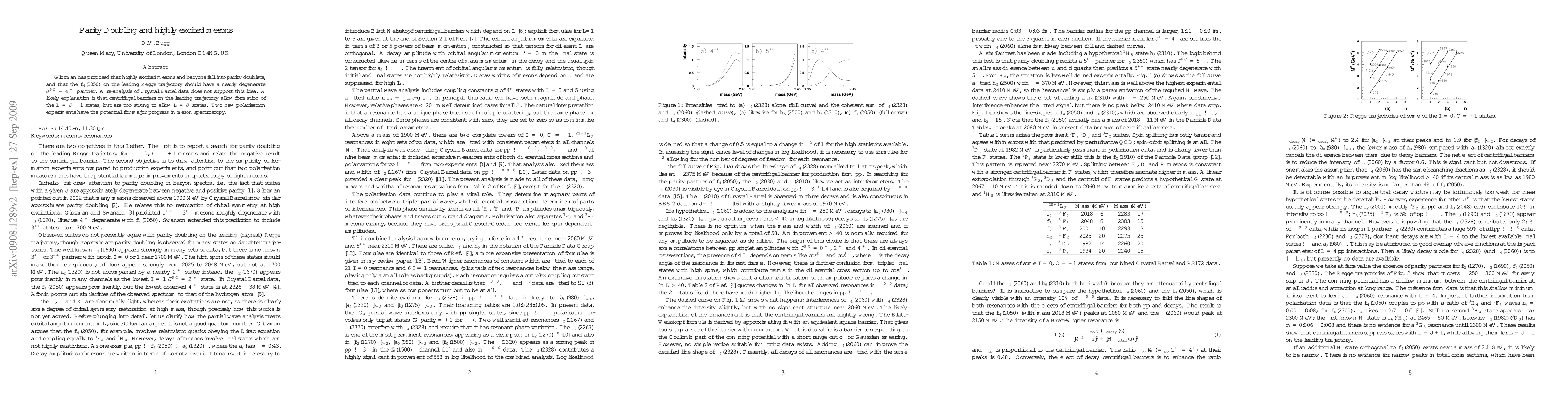 Glozman has proposed that highly excited mesons and baryons fall into parity doublets, and that the f4(2050) on the leading Regge trajectory should have a nearly degenerate J^{PC} = 4^{-+} partner. A re-analysis of Crystal Barrel data does not support this idea. A likely explanation is that centrifugal barriers on the leading trajectory allow formation of the L=J-1 states, but are too strong to allow L=J states. Two new polarisation experiments have the potential for major progress in meson spectroscopy.
