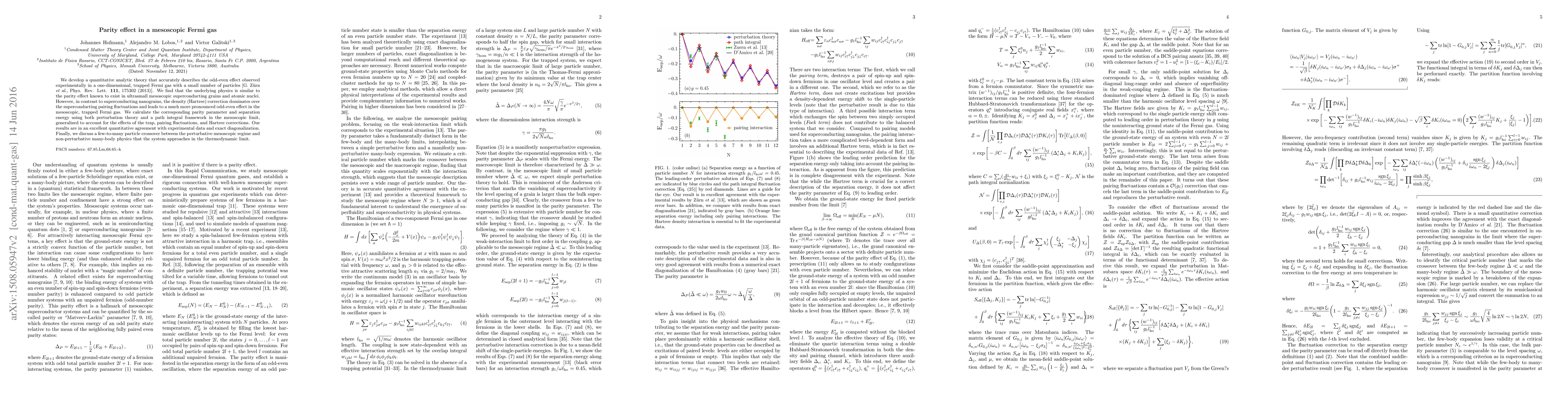 We develop a quantitative analytic theory that accurately describes the odd-even effect observed experimentally in a one-dimensional, trapped Fermi gas with a small number of particles [G. Z\"urn et al., Phys. Rev. Lett. 111, 175302 (2013)]. We find that the underlying physics is similar to the parity effect known to exist in ultrasmall mesoscopic superconducting grains and atomic nuclei. However, in contrast to superconducting nanograins, the density (Hartree) correction dominates over the superconducting pairing fluctuations and leads to a much more pronounced odd-even effect in the mesoscopic, trapped Fermi gas. We calculate the corresponding parity parameter and separation energy using both perturbation theory and a path integral framework in the mesoscopic limit, generalized to account for the effects of the trap, pairing fluctuations, and Hartree corrections. Our results are in an excellent quantitative agreement with experimental data and exact diagonalization. Finally, we discuss a few-to-many particle crossover between the perturbative mesoscopic regime and non-perturbative many-body physics that the system approaches in the thermodynamic limit.