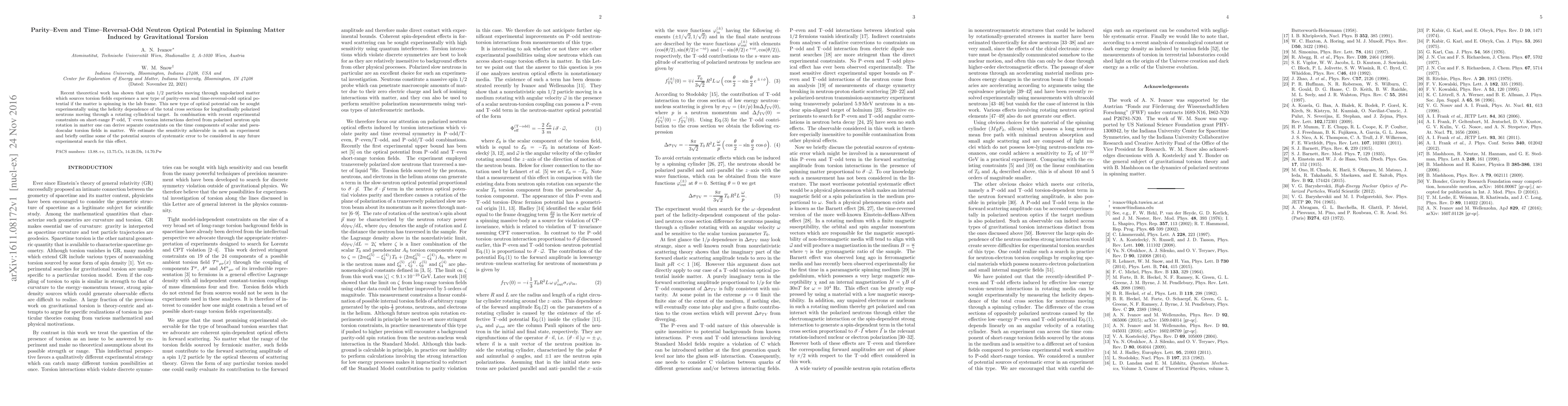 This paper explores a new parity-even and time-reversal-odd optical potential experienced by spin $1/2$ particles in spinning matter generating torsion fields. It proposes experimental methods to detect this effect using polarized neutrons and discusses potential constraints and systematic errors for future searches.