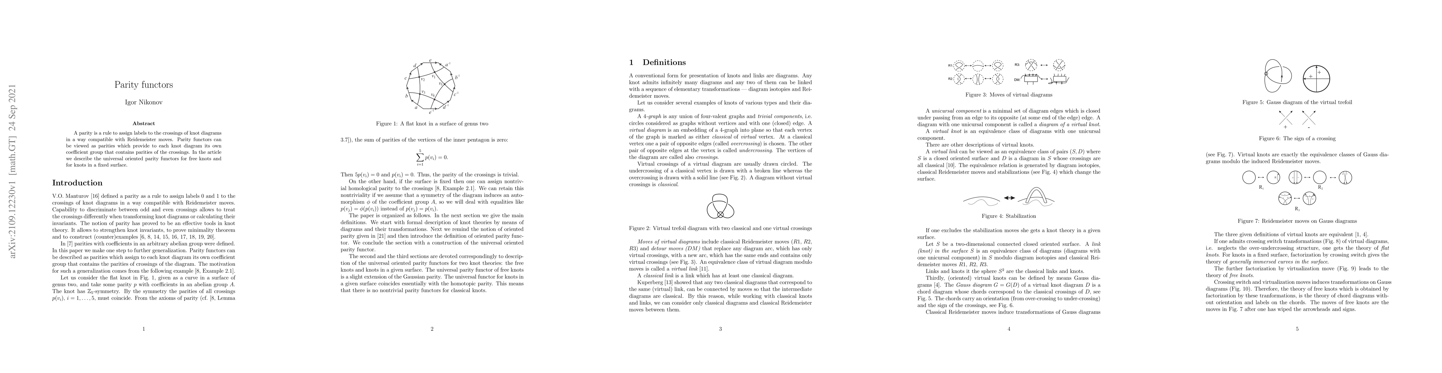 The paper introduces parity functors as rules assigning labels to knot diagram crossings, compatible with Reidemeister moves, and describes universal oriented parity functors for both free knots and knots within a fixed surface. These functors link each knot diagram to a coefficient group reflecting crossing parities.