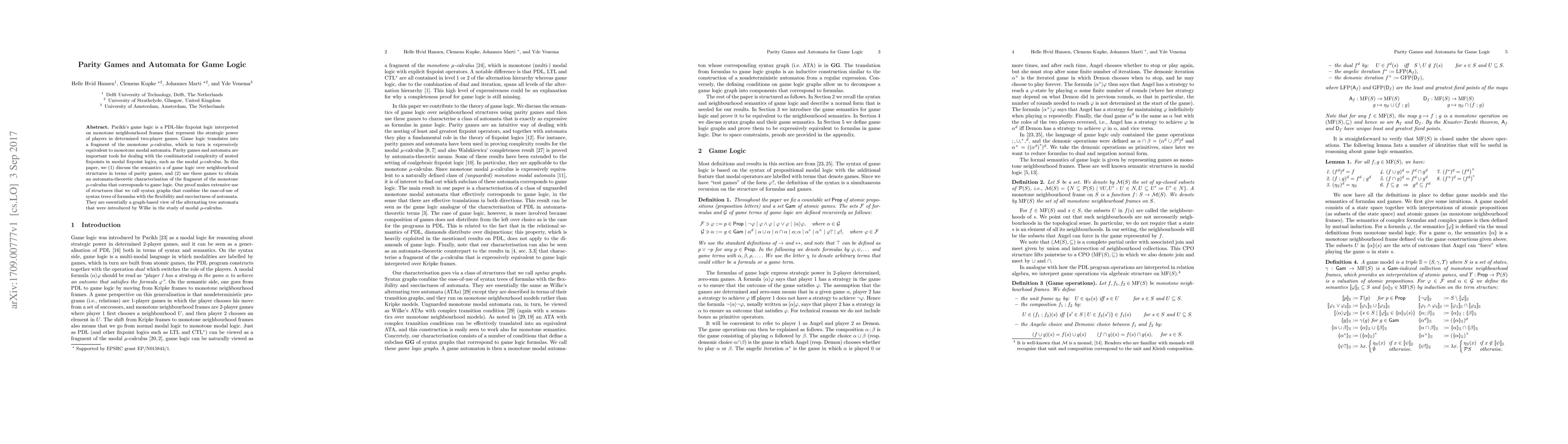 Parikh's game logic is a PDL-like fixpoint logic interpreted on monotone neighbourhood frames that represent the strategic power of players in determined two-player games. Game logic translates into a fragment of the monotone $\mu$-calculus, which in turn is expressively equivalent to monotone modal automata. Parity games and automata are important tools for dealing with the combinatorial complexity of nested fixpoints in modal fixpoint logics, such as the modal $\mu$-calculus. In this paper, we (1) discuss the semantics a of game logic over neighbourhood structures in terms of parity games, and (2) use these games to obtain an automata-theoretic characterisation of the fragment of the monotone $\mu$-calculus that corresponds to game logic. Our proof makes extensive use of structures that we call syntax graphs that combine the ease-of-use of syntax trees of formulas with the flexibility and succinctness of automata. They are essentially a graph-based view of the alternating tree automata that were introduced by Wilke in the study of modal $\mu$-calculus.