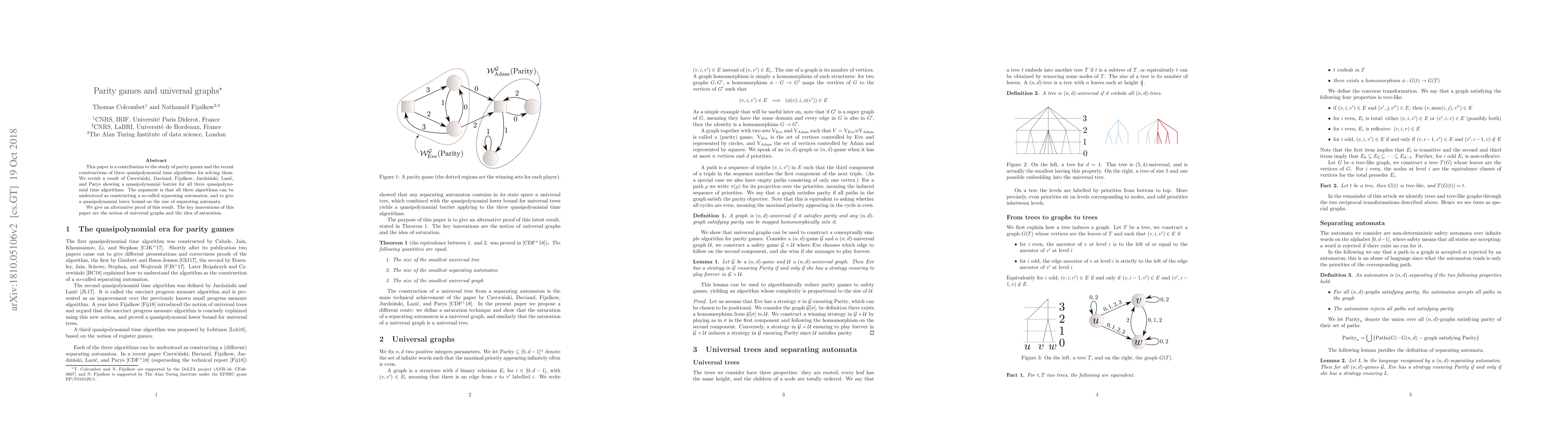 This paper is a contribution to the study of parity games and the recent constructions of three quasipolynomial time algorithms for solving them. We revisit a result of Czerwi\'nski, Daviaud, Fijalkow, Jurdzi\'nski, Lazi\'c, and Parys witnessing a quasipolynomial barrier for all three quasipolynomial time algorithms. The argument is that all three algorithms can be understood as constructing a so-called separating automaton, and to give a quasipolynomial lower bond on the size of separating automata. We give an alternative proof of this result. The key innovations of this paper are the notion of universal graphs and the idea of saturation.