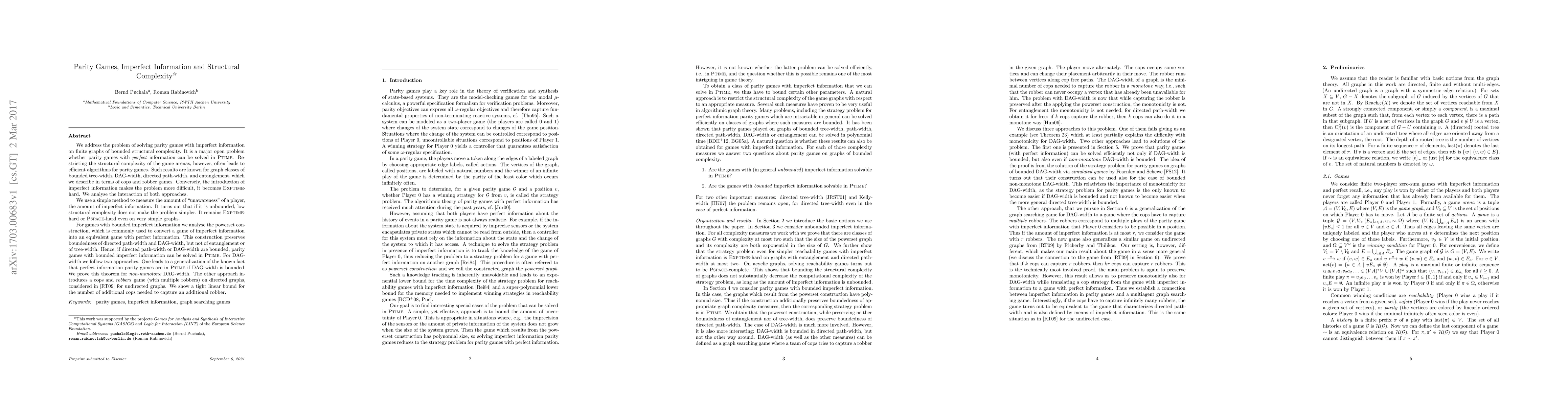 We address the problem of solving parity games with imperfect information on finite graphs of bounded structural complexity. It is a major open problem whether parity games with perfect information can be solved in PTIME. Restricting the structural complexity of the game arenas, however, often leads to efficient algorithms for parity games. Such results are known for graph classes of bounded tree-width, DAG-width, directed path-width, and entanglement, which we describe in terms of cops and robber games. Conversely, the introduction of imperfect information makes the problem more difficult, it becomes EXPTIME-hard. We analyse the interaction of both approaches. We use a simple method to measure the amount of "unawareness"' of a player, the amount of imperfect information. It turns out that if it is unbounded, low structural complexity does not make the problem simpler. It remains EXPTIME-hard or PSPACE-hard even on very simple graphs. For games with bounded imperfect information we analyse the powerset construction, which is commonly used to convert a game of imperfect information into an equivalent game with perfect information. This construction preserves boundedness of directed path-width and DAG-width, but not of entanglement or of tree-width. Hence, if directed path-width or DAG-width are bounded, parity games with bounded imperfect information can be solved in PTIME. For DAG-width we follow two approaches. One leads to a generalization of the known fact that perfect information parity games are in PTIME if DAG-width is bounded. We prove this theorem for non-monotone DAG-width. The other approach introduces a cops and robbers game (with multiple robbers) on directed graphs, considered Richerby and Thilikos forundirected graphs. We show a tight linear bound for the number of additional cops needed to capture an additional robber.