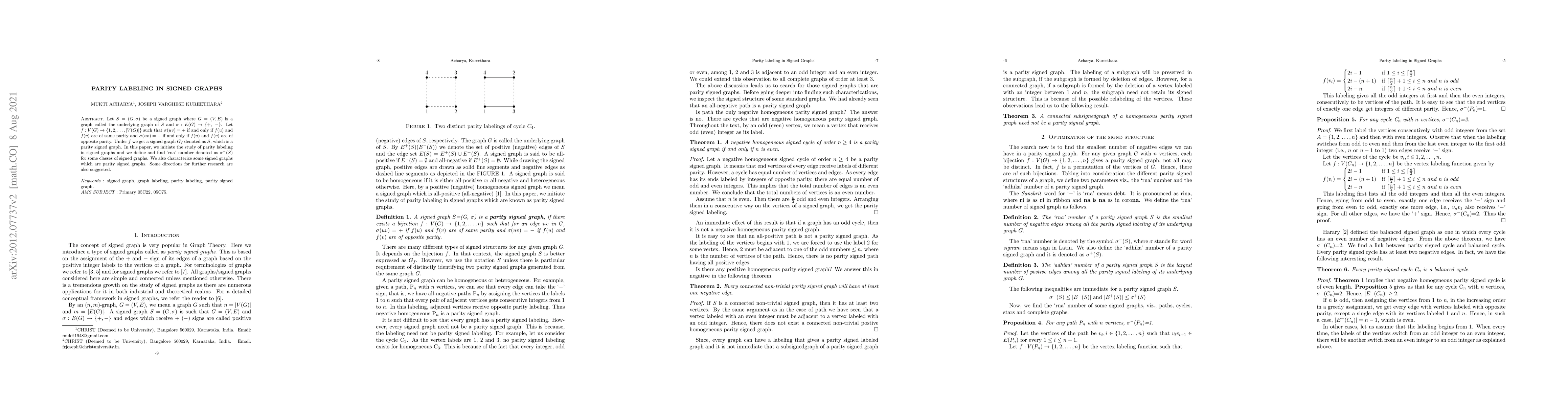 This paper introduces the concept of parity labeling in signed graphs, defining a function that assigns labels to vertices such that edges are positive if the vertices have the same parity and negative if they have opposite parity. It explores the `rna' number $\sigma^-(S)$ for specific classes of signed graphs and characterizes certain signed graphs as parity signed graphs.