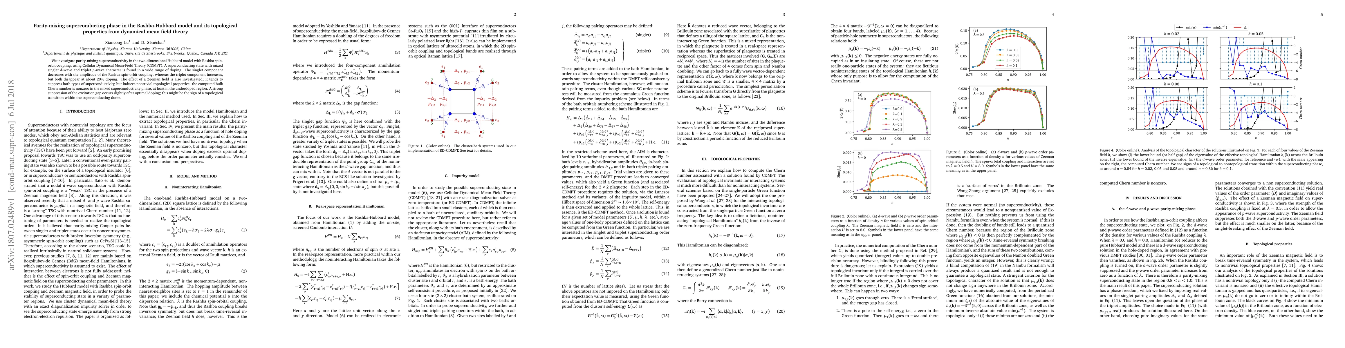 We investigate parity-mixing superconductivity in the two-dimensional Hubbard model with Rashba spin-orbit coupling, using Cellular Dynamical Mean-Field Theory (CDMFT). A superconducting state with mixed singlet $d$-wave and triplet $p$-wave character is found in a wide range of doping. The singlet component decreases with the amplitude of the Rashba spin-orbit coupling, whereas the triplet component increases, but both disappear at about 20\% doping. The effect of a Zeeman field is also investigated; it tends to suppress both types of superconductivity, but induces nontrivial topological properties: the computed bulk Chern number is nonzero in the mixed superconductivity phase, at least in the underdoped region. A strong suppression of the excitation gap occurs slightly after optimal doping; this might be the sign of a topological transition within the superconducting dome.