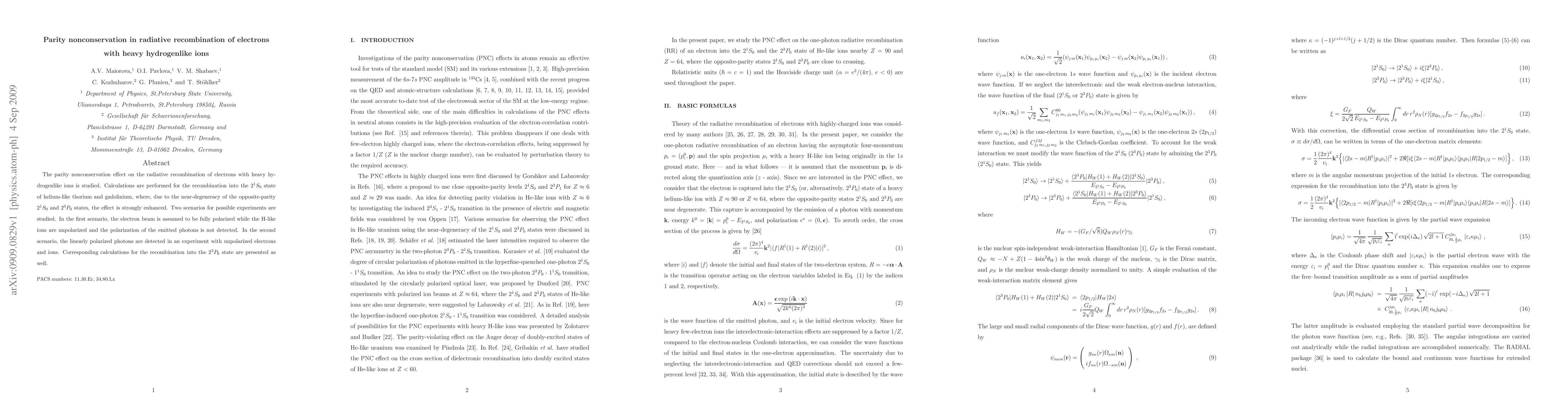 This paper investigates parity nonconservation in radiative recombination of electrons with heavy hydrogenlike ions, focusing on helium-like thorium and gadolinium. It explores two experimental scenarios to detect this effect, highlighting the enhanced effect due to near-degeneracy of opposite-parity states.