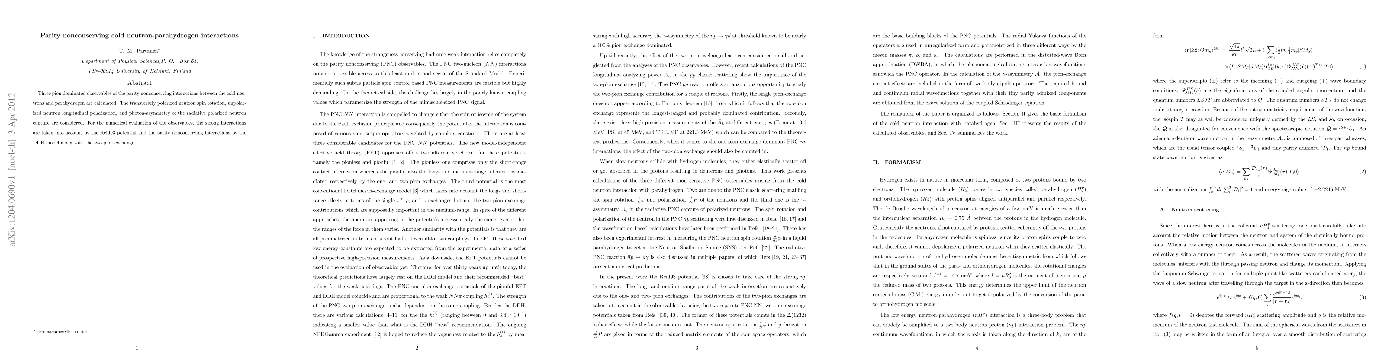 This paper calculates three observables for parity nonconserving interactions between cold neutrons and parahydrogen, using the Reid93 potential for strong interactions and the DDH model for the parity nonconserving effects, including two-pion exchange. The observables include neutron spin rotation, longitudinal polarization, and radiative polarized neutron capture photon asymmetry.