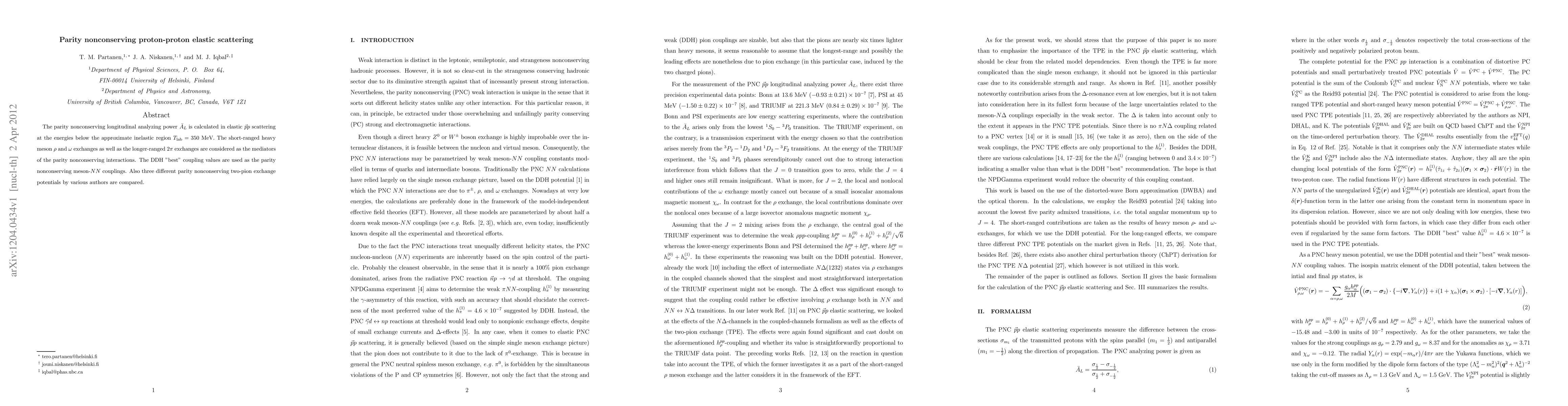 The parity nonconserving longitudinal analyzing power A_L is calculated in elastic pp scattering at the energies below the approximate inelastic region T_lab = 350 MeV. The short-ranged heavy meson rho and omega exchanges as well as the longer-ranged two pion exchanges are considered as the mediators of the parity nonconserving interactions. The DDH "best" coupling values are used as the parity nonconserving meson-NN couplings. Also three different parity nonconserving two-pion exchange potentials by various authors are compared.