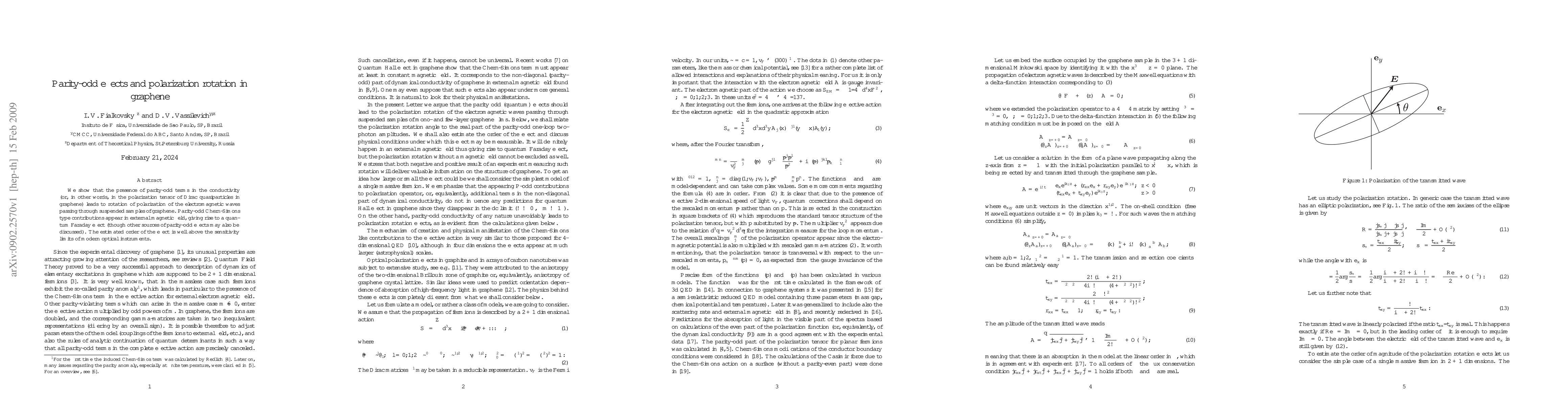 We show that the presence of parity-odd terms in the conductivity (or, in other words, in the polarization tensor of Dirac quasiparticles in graphene) leads to rotation of polarization of the electromagnetic waves passing through suspended samples of graphene. Parity-odd Chern-Simons type contributions appear in external magnetic field, giving rise to a quantum Faraday effect (though other sources of parity-odd effects may also be discussed). The estimated order of the effect is well above the sensitivity limits of modern optical instruments.