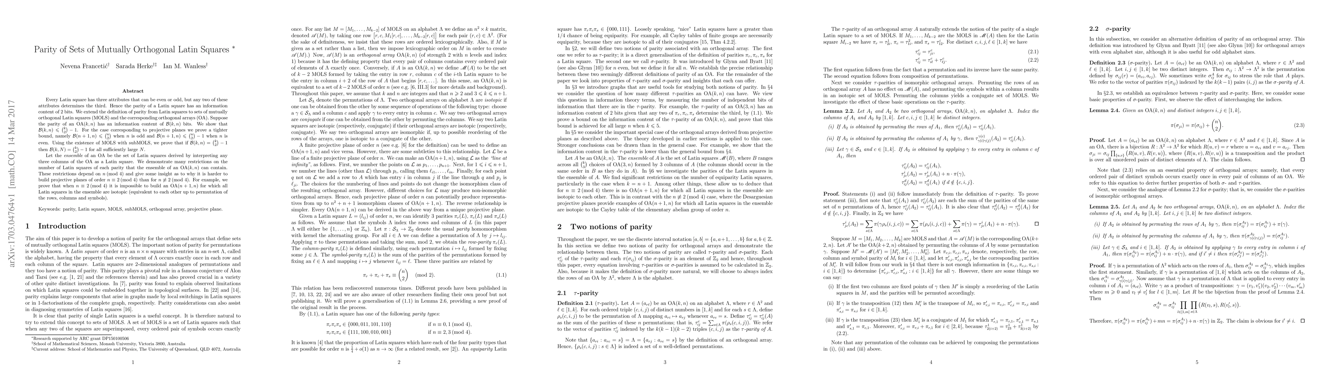 This paper explores the parity information content of sets of mutually orthogonal Latin squares (MOLS) and orthogonal arrays (OA). It establishes an upper bound for the information content of MOLS and provides tighter bounds for projective planes, revealing why constructing projective planes for certain orders is more challenging.