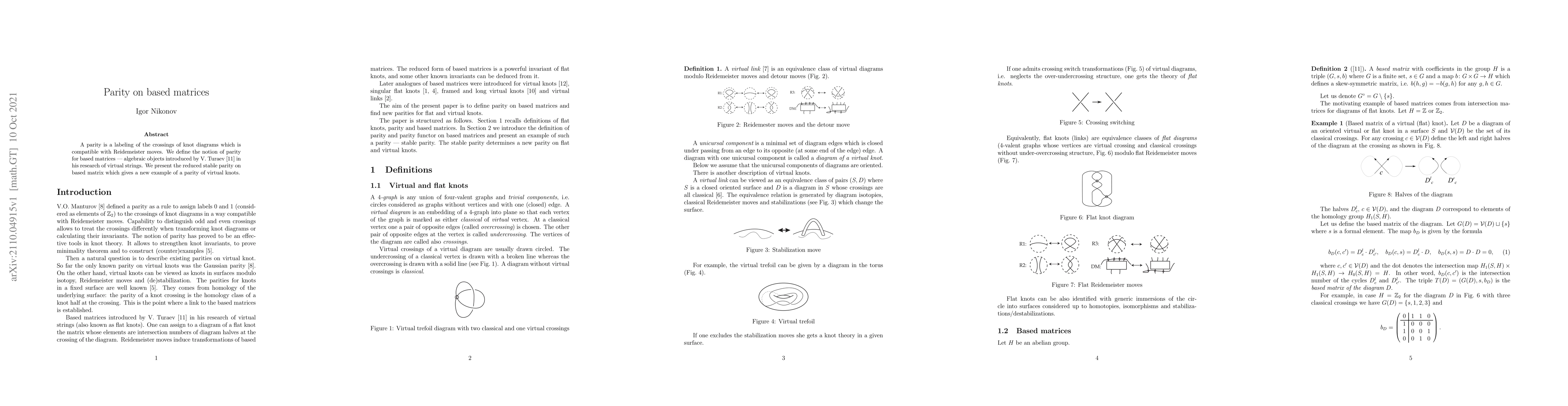 A parity is a labeling of the crossings of knot diagrams which is compatible with Reidemeister moves. We define the notion of parity for based matrices -- algebraic objects introduced by V. Turaev in his research of virtual strings. We present the reduced stable parity on based matrix which gives a new example of a parity of virtual knots.