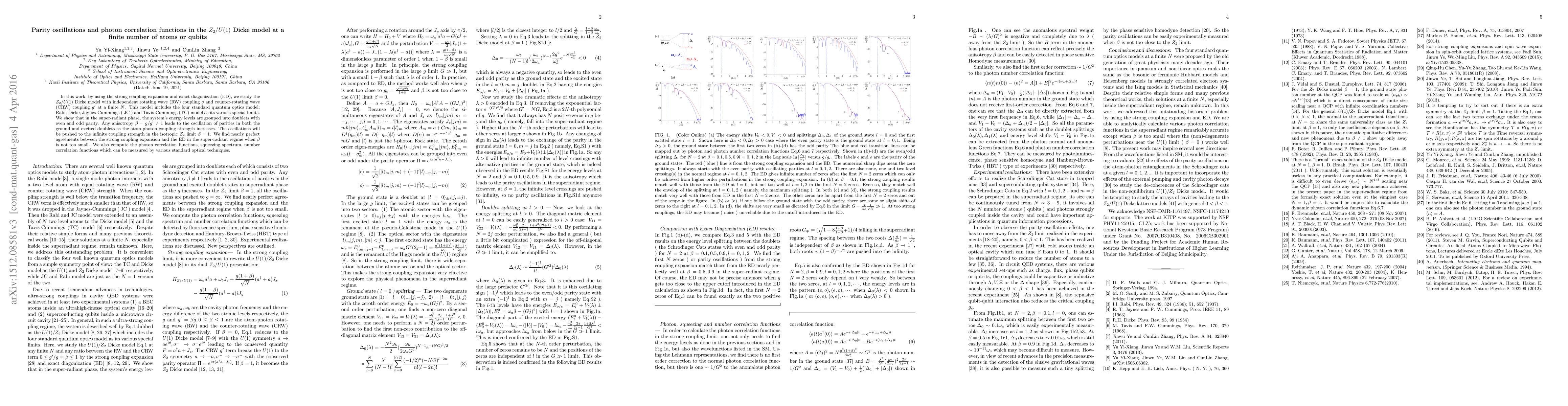 In this work, by using the strong coupling expansion and exact diagonization (ED), we study the $ Z_2/U(1) $ Dicke model with independent rotating wave (RW) coupling $ g $ and counter-rotating wave (CRW) coupling $ g^{\prime} $ at a finite $ N $. This model includes the four standard quantum optics model: Rabi, Dicke, Jaynes-Cummings ( JC ) and Tavis-Cummings (TC) model as its various special limits. We show that in the super-radiant phase, the system's energy levels are grouped into doublets with even and odd parity. Any anisotropy $ \beta=g/g^{\prime} \neq 1 $ leads to the oscillation of parities in both the ground and excited doublets as the atom-photon coupling strength increases. The oscillations will be pushed to the infinite coupling strength in the isotropic $ Z_2 $ limit $ \beta=1 $. We find nearly perfect agreements between the strong coupling expansion and the ED in the super-radiant regime. We also compute the photon correlation functions, squeezing spectrum, number correlation functions which can be measured by various standard optical techniques.
