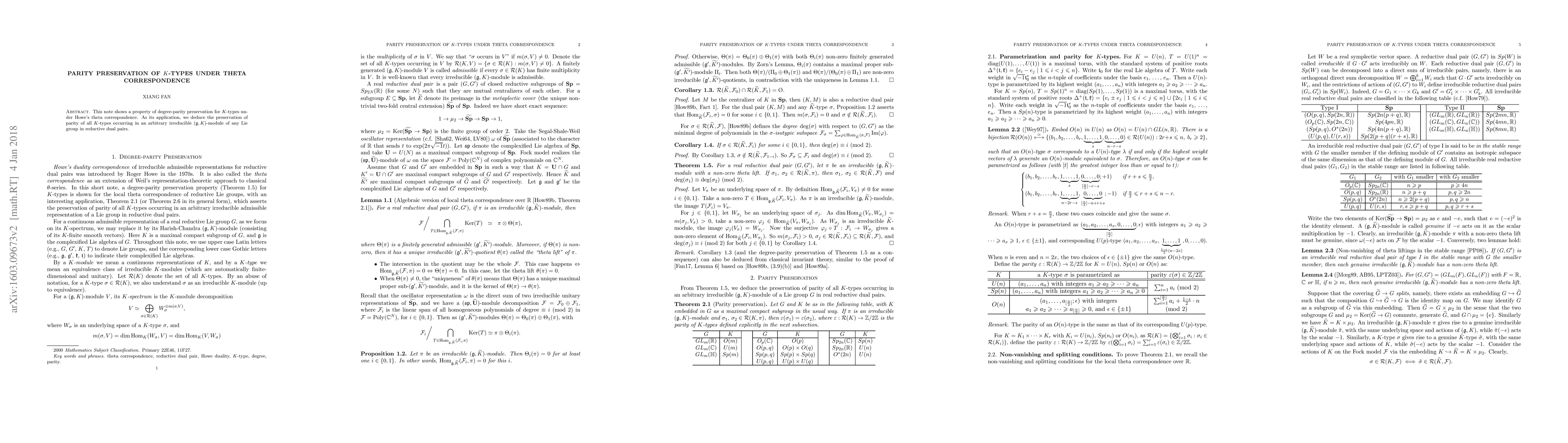 This note shows a property of degree-parity preservation for $K$-types under Howe's theta correspondence. As its application, we deduce the preservation of parity of all $K$-types occurring in an arbitrary irreducible $(\mathfrak{g},K)$-module of any Lie group in reductive dual pairs.