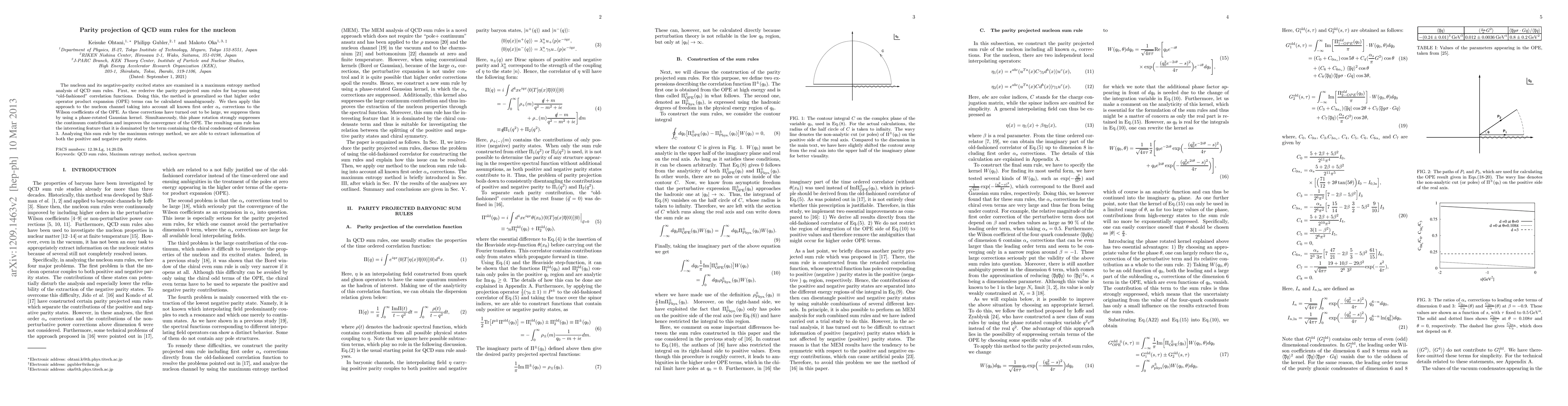 This paper rederives parity-projected QCD sum rules for nucleons using a maximum entropy method, incorporating higher-order operator product expansion terms. The analysis reveals that the sum rule is primarily influenced by the chiral condensate, allowing extraction of information on both positive and negative parity states.
