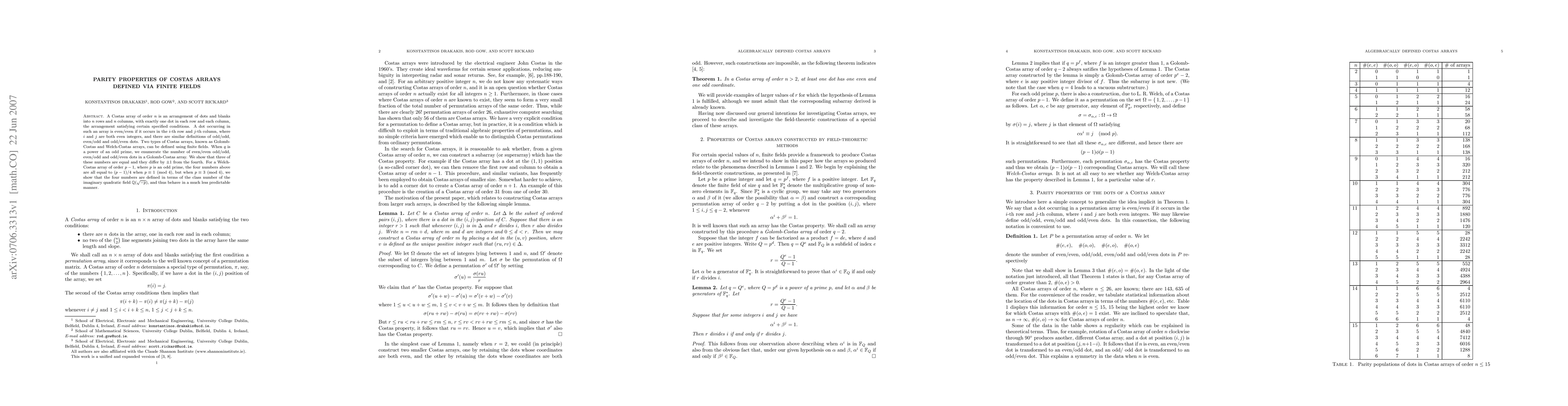 A Costas array of order $n$ is an arrangement of dots and blanks into $n$ rows and $n$ columns, with exactly one dot in each row and each column, the arrangement satisfying certain specified conditions. A dot occurring in such an array is even/even if it occurs in the $i$-th row and $j$-th column, where $i$ and $j$ are both even integers, and there are similar definitions of odd/odd, even/odd and odd/even dots. Two types of Costas arrays, known as Golomb-Costas and Welch-Costas arrays, can be defined using finite fields. When $q$ is a power of an odd prime, we enumerate the number of even/even odd/odd, even/odd and odd/even dots in a Golomb-Costas array. We show that three of these numbers are equal and they differ by $\pm 1$ from the fourth. For a Welch-Costas array of order $p-1$, where $p$ is an odd prime, the four numbers above are all equal to $(p-1)/4$ when $p\equiv 1\pmod{4}$, but when $p\equiv 3\pmod{4}$, we show that the four numbers are defined in terms of the class number of the imaginary quadratic field $\mathbb{Q}(\sqrt{-p})$, and thus behave in a much less predictable manner.