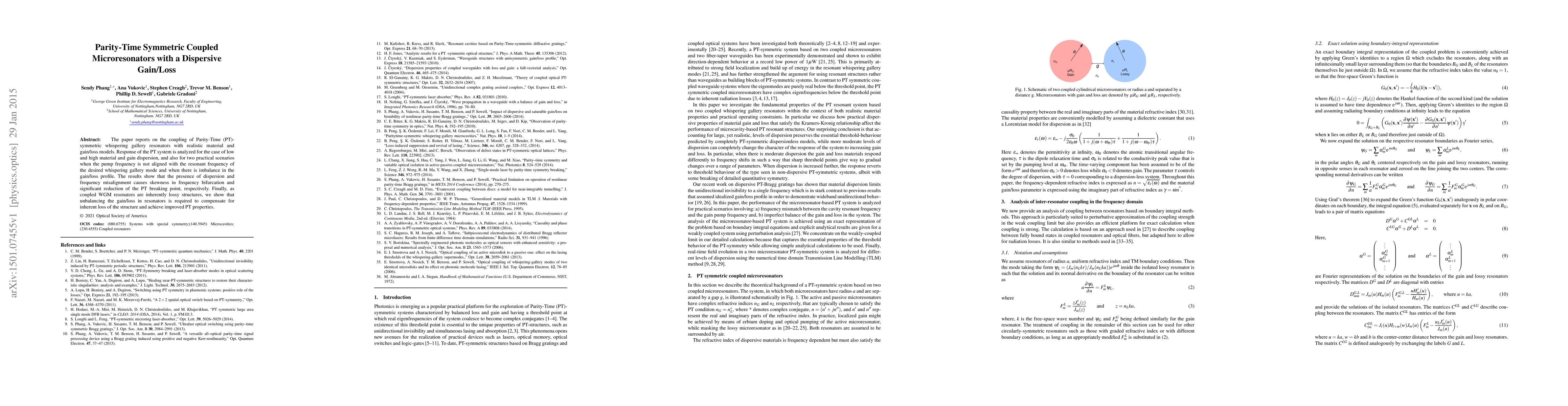The study examines the coupling of PT-symmetric whispering gallery resonators under realistic material and gain/loss conditions, demonstrating that dispersion and frequency misalignment skew bifurcation and reduce PT symmetry breaking points. Unbalancing gain/loss in coupled resonators compensates for inherent losses and enhances PT properties.
