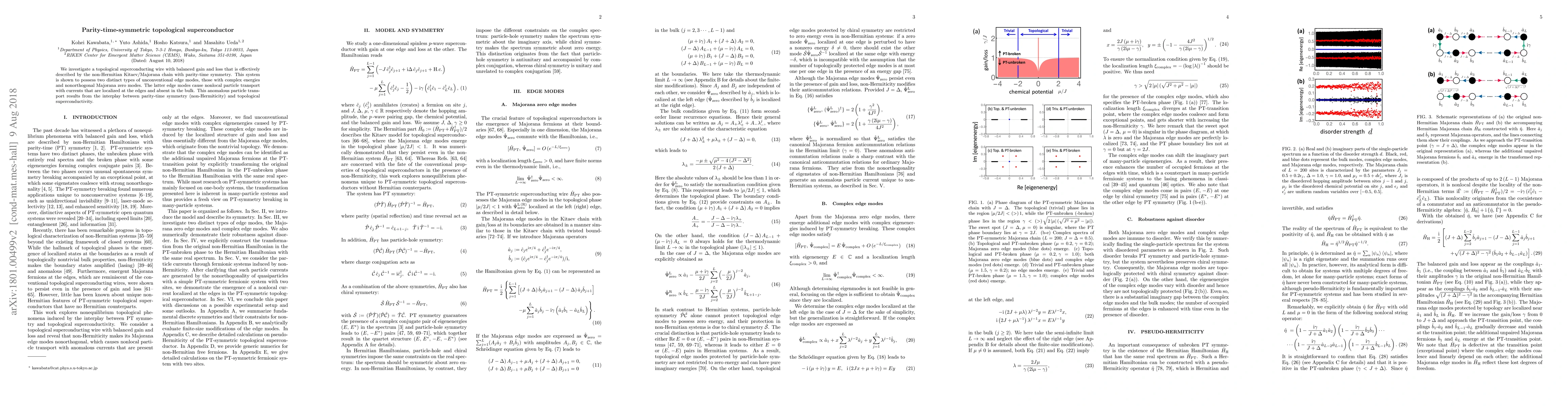 We investigate a topological superconducting wire with balanced gain and loss that is effectively described by the non-Hermitian Kitaev/Majorana chain with parity-time symmetry. This system is shown to possess two distinct types of unconventional edge modes, those with complex energies and nonorthogonal Majorana zero modes. The latter edge modes cause nonlocal particle transport with currents that are localized at the edges and absent in the bulk. This anomalous particle transport results from the interplay between parity-time symmetry (non-Hermiticity) and topological superconductivity.