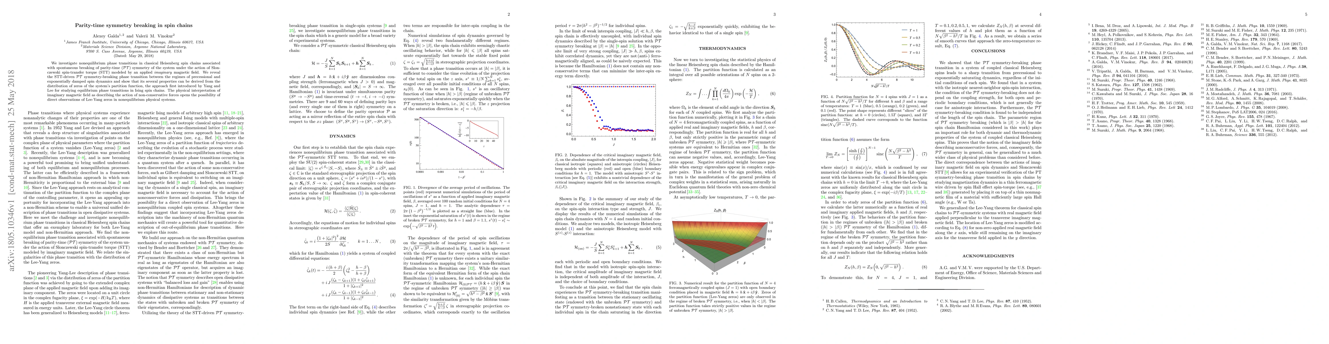 This paper explores nonequilibrium phase transitions in classical Heisenberg spin chains driven by Slonczewski spin-transfer torque, revealing a $\mathcal{PT}$ symmetry-breaking transition. The study connects the transition's properties to the distribution of zeros of the system's partition function, analogous to Lee-Yang zeros in equilibrium systems, and suggests the possibility of observing these zeros in nonequilibrium scenarios.
