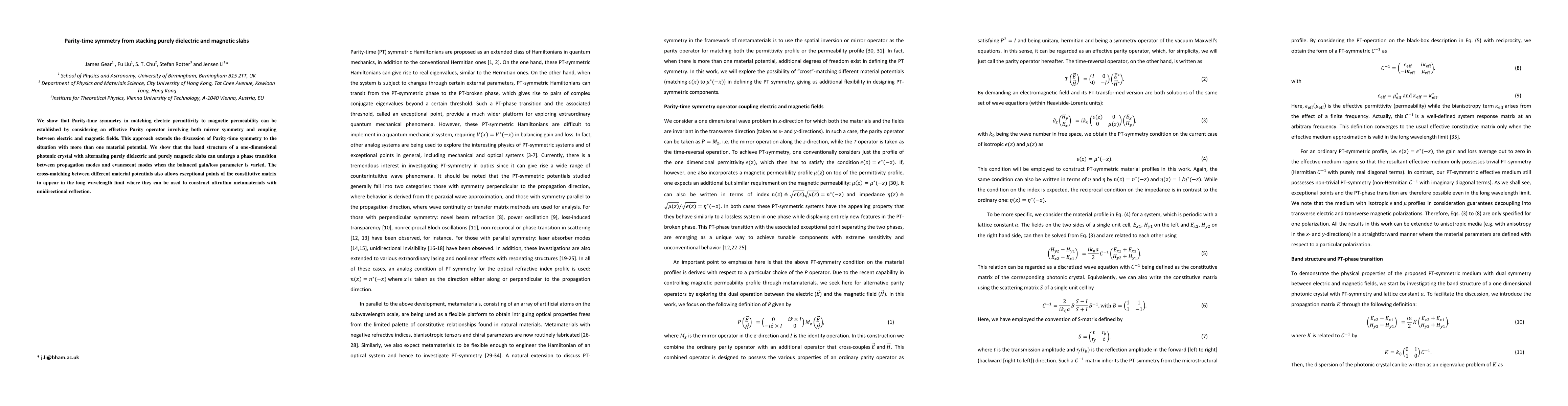 We show that Parity-time symmetry in matching electric permittivity to magnetic permeability can be established by considering an effective Parity operator involving both mirror symmetry and coupling between electric and magnetic fields. This approach extends the discussion of Parity-time symmetry to the situation with more than one material potential. We show that the band structure of a one-dimensional photonic crystal with alternating purely dielectric and purely magnetic slabs can undergo a phase transition between propagation modes and evanescent modes when the balanced gain/loss parameter is varied. The cross-matching between different material potentials also allows exceptional points of the constitutive matrix to appear in the long wavelength limit where they can be used to construct ultrathin metamaterials with unidirectional reflection.