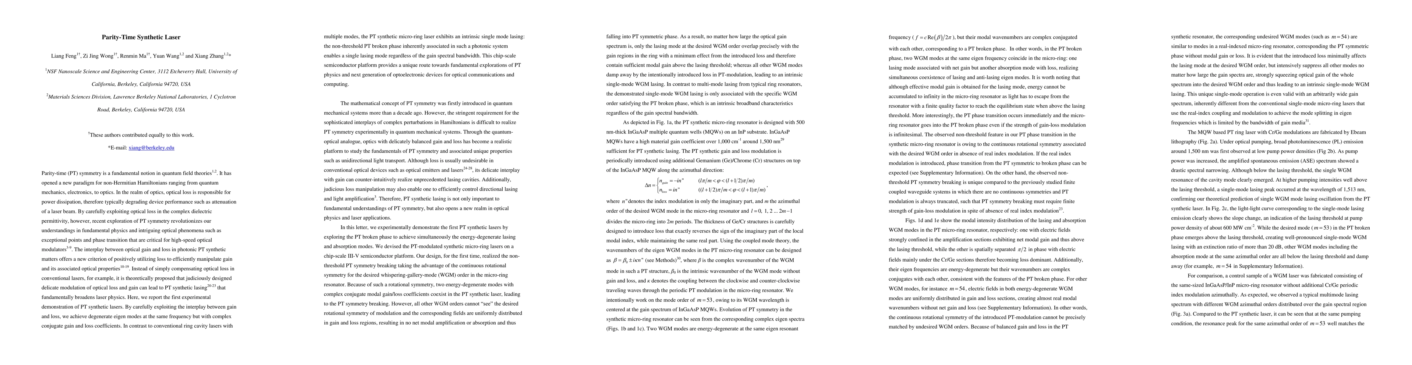 Parity-time (PT) symmetry is a fundamental notion in quantum field theories. It has opened a new paradigm for non-Hermitian Hamiltonians ranging from quantum mechanics, electronics, to optics. In the realm of optics, optical loss is responsible for power dissipation, therefore typically degrading device performance such as attenuation of a laser beam. By carefully exploiting optical loss in the complex dielectric permittivity, however, recent exploration of PT symmetry revolutionizes our understandings in fundamental physics and intriguing optical phenomena such as exceptional points and phase transition that are critical for high-speed optical modulators. The interplay between optical gain and loss in photonic PT synthetic matters offers a new criterion of positively utilizing loss to efficiently manipulate gain and its associated optical properties. Instead of simply compensating optical loss in conventional lasers, for example, it is theoretically proposed that judiciously designed delicate modulation of optical loss and gain can lead to PT synthetic lasing that fundamentally broadens laser physics. Here, we report the first experimental demonstration of PT synthetic lasers. By carefully exploiting the interplay between gain and loss, we achieve degenerate eigen modes at the same frequency but with complex conjugate gain and loss coefficients. In contrast to conventional ring cavity lasers with multiple modes, the PT synthetic micro-ring laser exhibits an intrinsic single mode lasing: the non-threshold PT broken phase inherently associated in such a photonic system squeezes broadband optical gain into a single lasing mode regardless of the gain spectral bandwidth. This chip-scale semiconductor platform provides a unique route towards fundamental explorations of PT physics and next generation of optoelectronic devices for optical communications and computing.