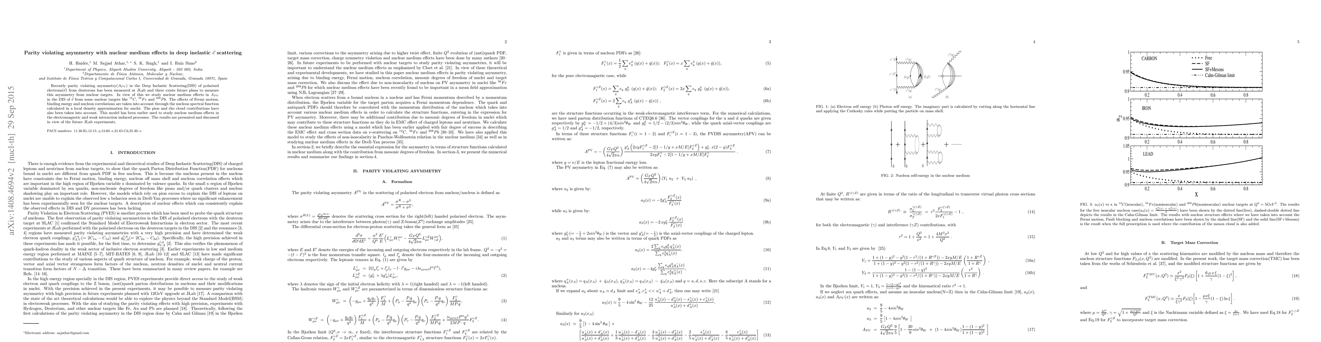 Researchers studied parity violating asymmetry in deep inelastic electron scattering off various nuclear targets like carbon, iron, and lead, accounting for medium effects using a local density approximation and Fermi motion.