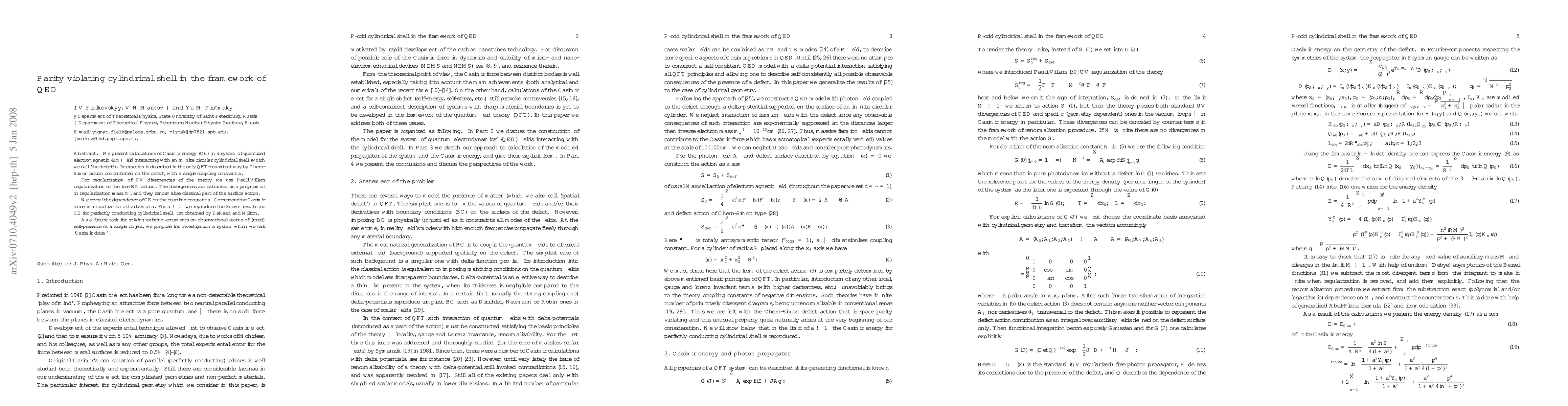 We present calculations of Casimir energy (CE) in a system of quantized electromagnetic (EM) field interacting with an infinite circular cylindrical shell (which we call `the defect'). Interaction is described in the only QFT-consistent way by Chern-Simon action concentrated on the defect, with a single coupling constant $a$. For regularization of UV divergencies of the theory we use % physically motivated Pauli-Villars regularization of the free EM action. The divergencies are extracted as a polynomial in regularization mass $M$, and they renormalize classical part of the surface action. We reveal the dependence of CE on the coupling constant $a$. Corresponding Casimir force is attractive for all values of $a$. For $a\to\infty$ we reproduce the known results for CE for perfectly conducting cylindrical shell first obtained by DeRaad and Milton.