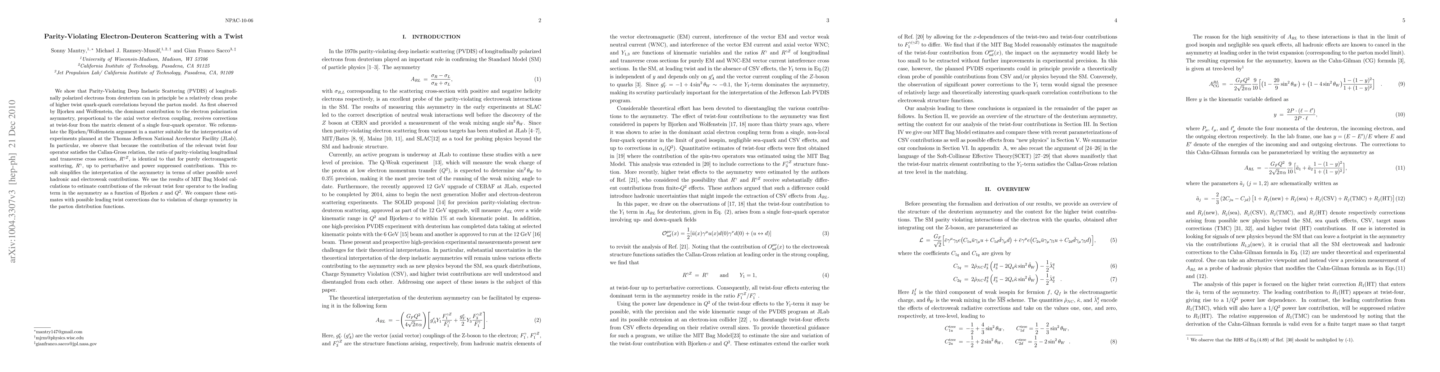 We show that Parity-Violating Deep Inelastic Scattering (PVDIS) of longitudinally polarized electrons from deuterium can in principle be a relatively clean probe of higher twist quark-quark correlations beyond the parton model. As first observed by Bjorken and Wolfenstein, the dominant contribution to the electron polarization asymmetry, proportional to the axial vector electron coupling, receives corrections at twist-four from the matrix element of a single four-quark operator. We reformulate the Bjorken/Wolfenstein argument in a matter suitable for the interpretation of experiments planned at the Thomas Jefferson National Accelerator Facility (JLab). In particular, we observe that because the contribution of the relevant twist four operator satisfies the Callan-Gross relation, the ratio of parity-violating longitudinal and transverse cross sections, R_{\gamma Z}, is identical to that for purely electromagnetic scattering, R_{\gamma}, up to perturbative and power suppressed contributions. This result simplifies the interpretation of the asymmetry in terms of other possible novel hadronic and electroweak contributions. We use the results of MIT Bag Model calculations to estimate contributions of the relevant twist four operator to the leading term in the asymmetry as a function of Bjorken x and Q2 . We compare these estimates with possible leading twist corrections due to violation of charge symmetry in the parton distribution functions.