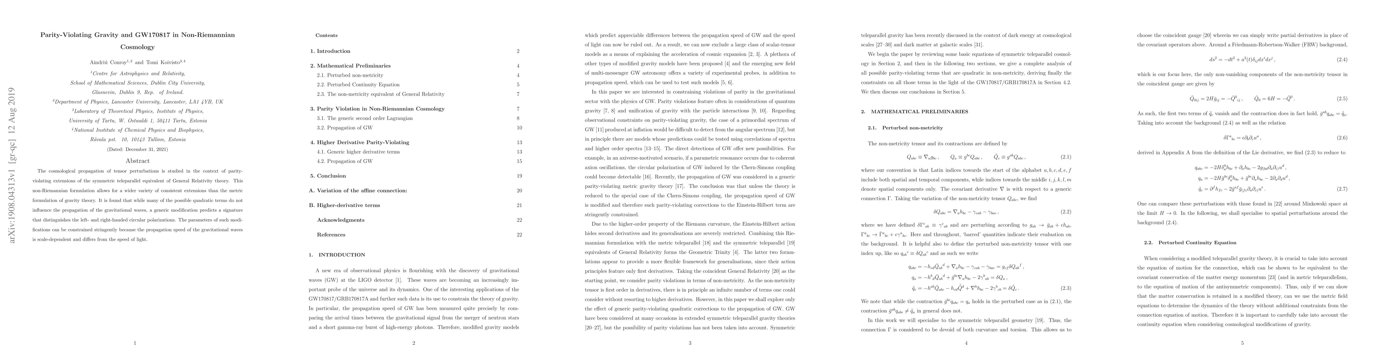 The cosmological propagation of tensor perturbations is studied in the context of parity-violating extensions of the symmetric teleparallel equivalent of General Relativity theory. This non-Riemannian formulation allows for a wider variety of consistent extensions than the metric formulation of gravity theory. It is found that while many of the possible quadratic terms do not influence the propagation of the gravitational waves, a generic modification predicts a signature that distinguishes the left- and right-handed circular polarizations. The parameters of such modifications can be constrained stringently because the propagation speed of the gravitational waves is scale-dependent and differs from the speed of light.