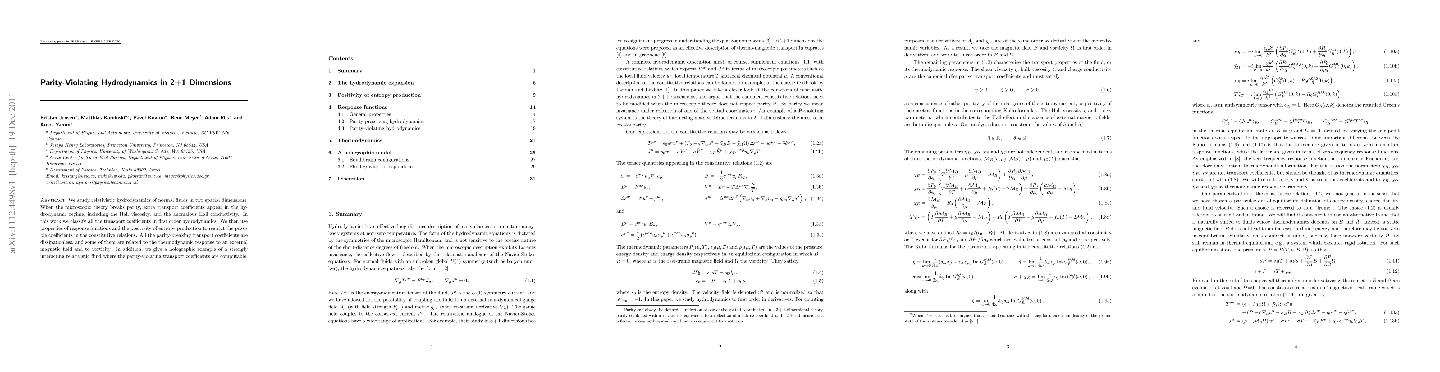 This research classifies transport coefficients in first-order hydrodynamics for 2+1D relativistic fluids with parity violation, identifying dissipationless effects like Hall viscosity and anomalous Hall conductivity. It uses response function properties and entropy production positivity to constrain these coefficients, and provides a holographic example of their manifestation in a strongly interacting fluid.