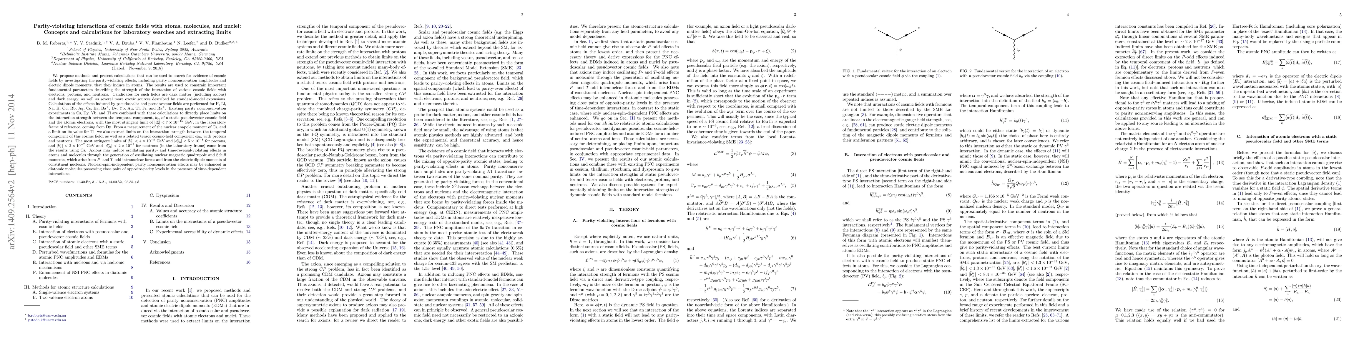 This paper proposes methods to search for cosmic fields via parity-violating effects in atoms, including calculations for constraining interaction strengths with electrons, protons, and neutrons. The most stringent limits on these interactions are derived from experiments on Cs, Dy, Yb, and Tl, with notable results for protons and neutrons from Cs.