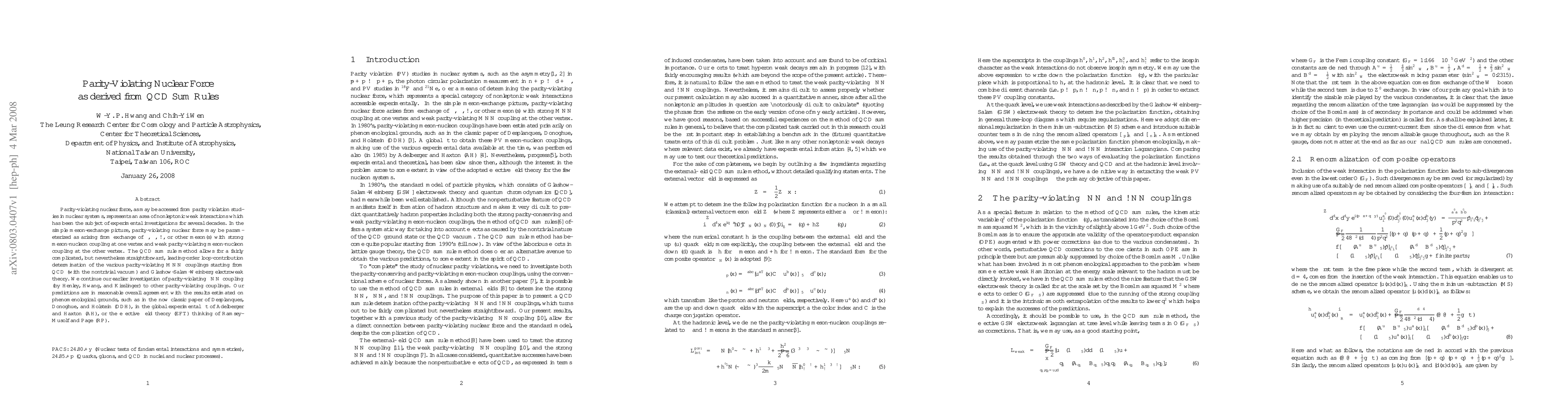 This paper derives the parity-violating nuclear force from QCD sum rules, predicting various meson-nucleon couplings that arise from nonleptonic weak interactions. The results align well with previous phenomenological and theoretical estimates.