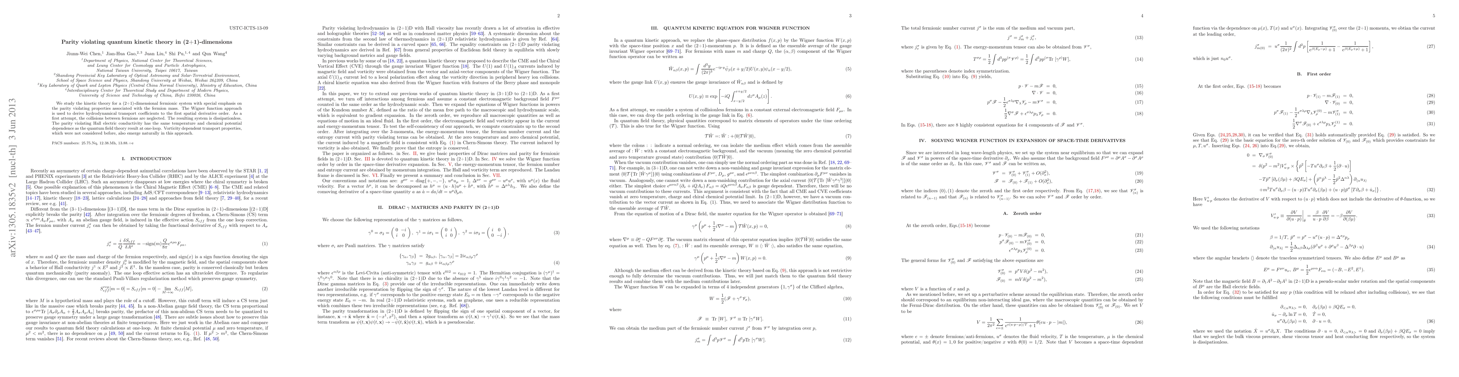 This paper explores the kinetic theory of a parity-violating (2+1)-dimensional fermionic system using the Wigner function, deriving hydrodynamic transport coefficients. It highlights the temperature and chemical potential dependence of the parity-violating Hall electric conductivity and introduces vorticity-dependent transport properties.