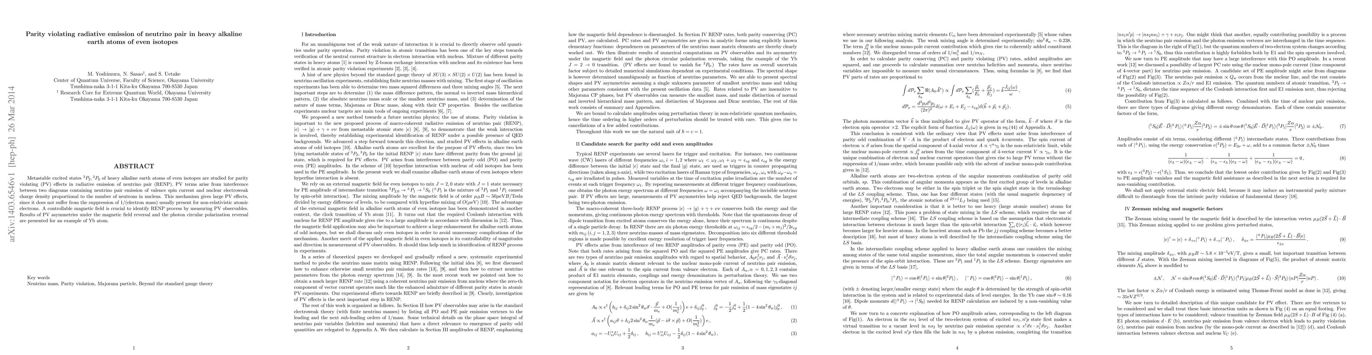 Metastable excited states ${}^3P_2, {}^3P_0$ of heavy alkaline earth atoms of even isotopes are studied for parity violating (PV) effects in radiative emission of neutrino pair (RENP). PV terms arise from interference between two diagrams containing neutrino pair emission of valence spin current and nuclear electroweak charge density proportional to the number of neutrons in nucleus. This mechanism gives large PV effects, since it does not suffer from the suppression of 1/(electron mass) usually present for non-relativistic atomic electrons. A controllable magnetic field is crucial to identify RENP process by measuring PV observables. Results of PV asymmetries under the magnetic field reversal and the photon circular polarization reversal are presented for an example of Yb atom.